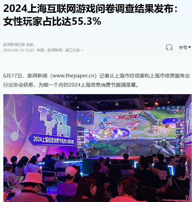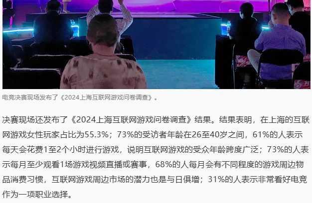 昨日澎湃新闻发出的2024上海互联网游戏问卷调查结果,结果表明,在上海的互联网游戏女性玩家占比为55.3%;73%的受访者年龄在26至40岁之间,61%的人表示每天会花费1至2个小时进行游戏,说明互联网游戏的受众年龄跨度广泛;73%的人表示每月至少观看1场游戏视频直播或赛事,68%的人每月会有不同程度的游戏周边物品消费习惯,互联网游戏周边市场的潜力也是与日俱增;31%的人表示非常看好电竞作为一项职业选择。