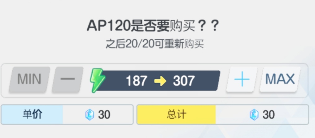 ◎玩家可以每天花费青辉石(钻石)来购买体力,每次120体力,前三次30钻,之后三次60钻,再之后三次100钻……碎钻就指花费钻石来购买体力,也会具体分为碎3,碎6等。