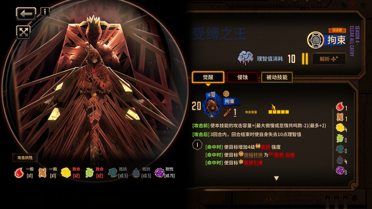 奥提斯开拘束融红震颤,红震颤在敌人混乱状态下加深一级的混乱等级,但不能超过最大混乱阶段