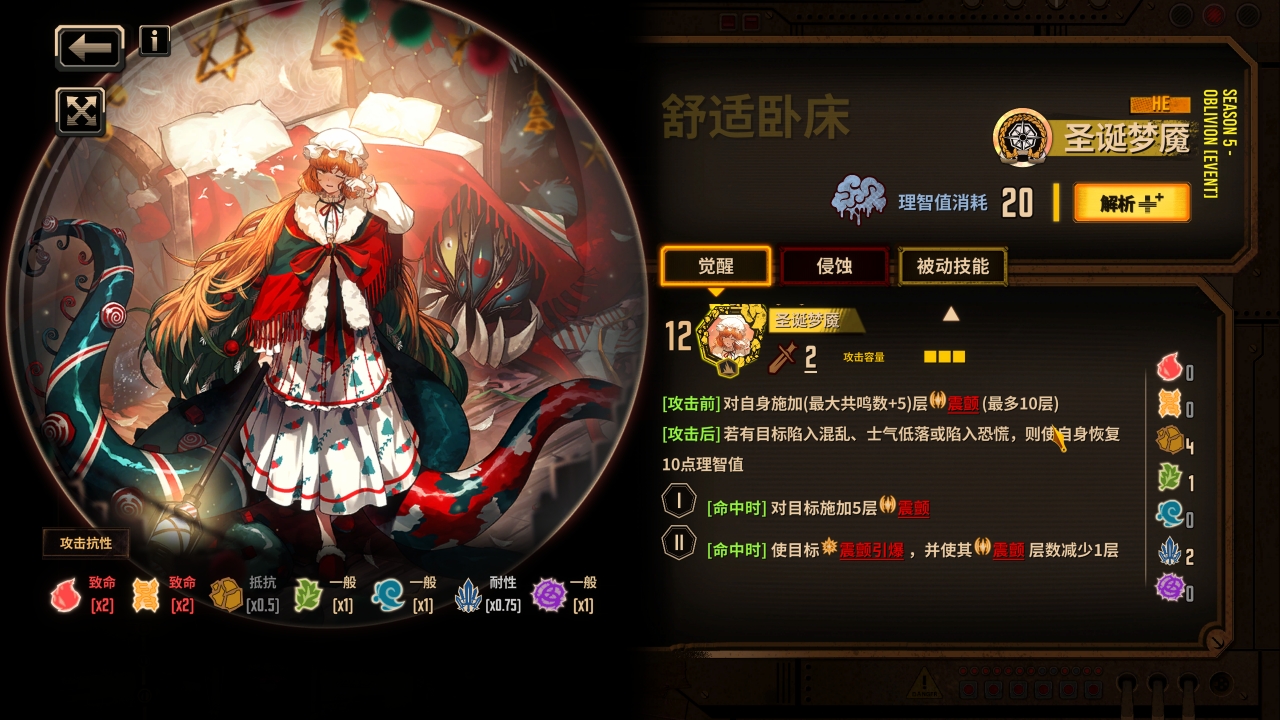 圣诞梦魇作为怠惰技能方便凑共鸣,可以给自己上震颤快速暖机,给对面上五层震颤,被动还能增幅全队提高队友给自己挂震颤的效率,侵蚀甚至只掉十点理智有击杀还能继续回理智