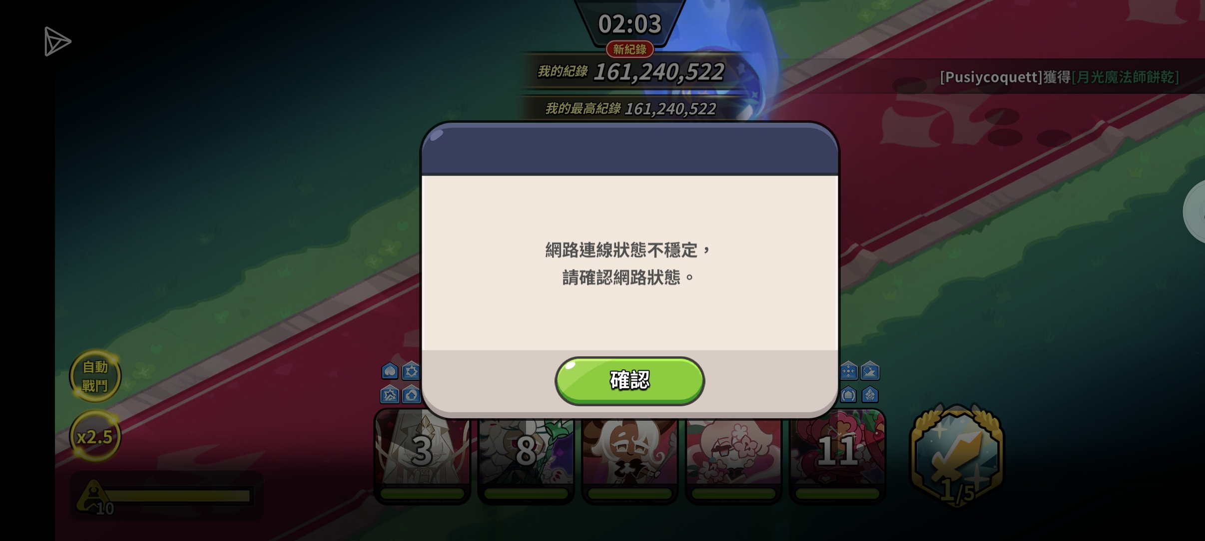 本来这边已经把活动打过了,等结算的时候突然跳出来一个说网络连接不行,我前面打几次都好好的,这个也一直点不下去就跟我杠上了,后面重启发现记录全没了…后面几次也出现了这样的毛病,但我没有截图,一样都是没有记录的