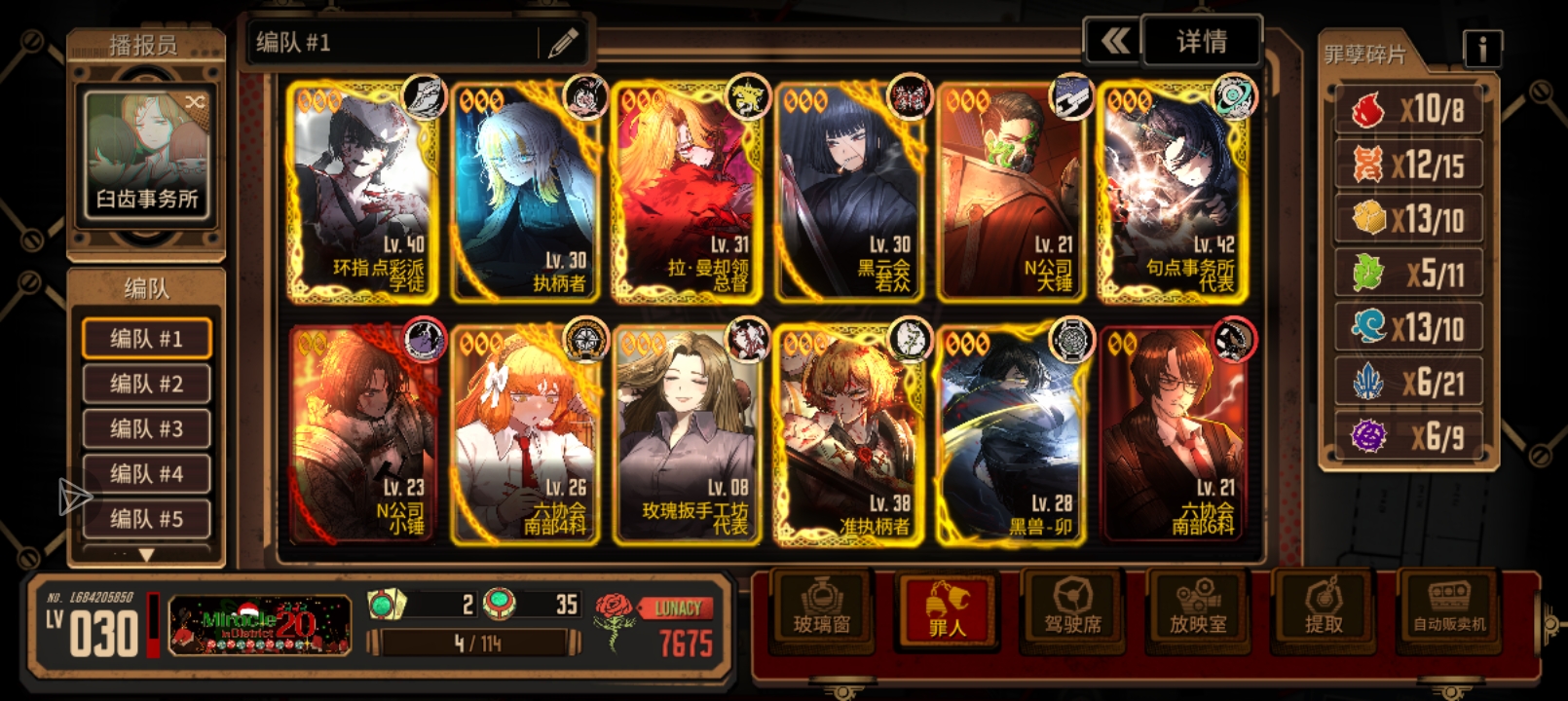 看了一眼你部分人格等级太低了,打到5.5怎么说也该有三四个40多级的三灯,而且n浮黑云良大锤玫瑰罗这种养了基本等于浪费资源。而且可以善用助战人格和抄别人低配通关的作业