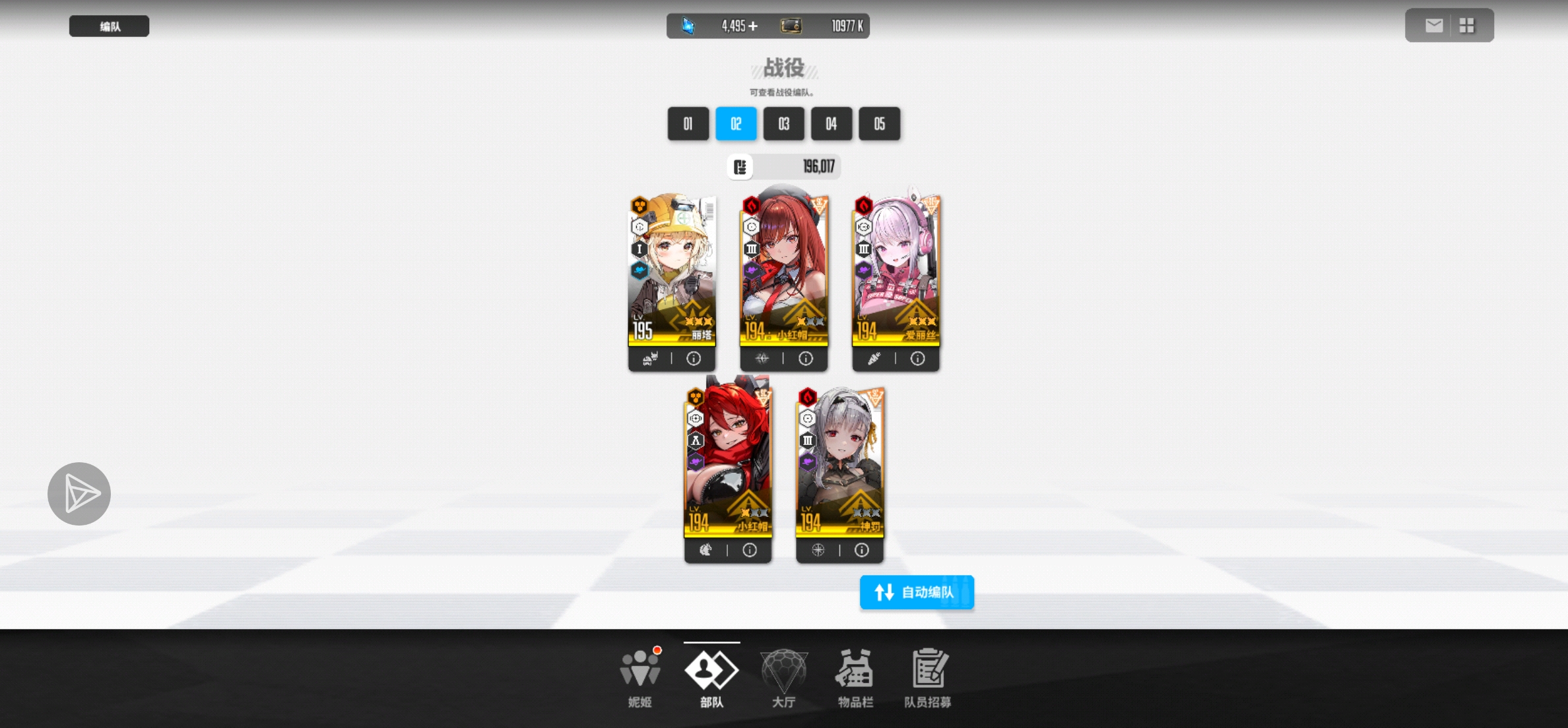 我的建议就是大红帽 丽塔 黑白jk 再带爱丽丝 神罚跟皇冠配对 你这个阵容配神罚不太好