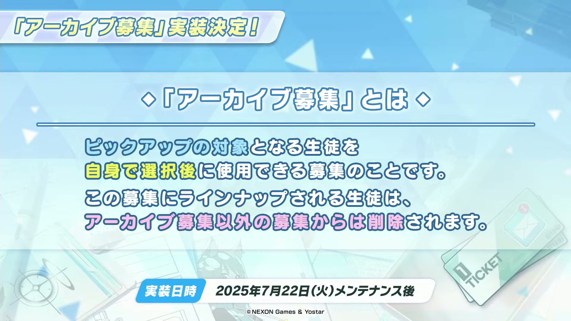 北京时间2025年7月22日(星期二)维护后,将实装全新的「档案招募」系统!