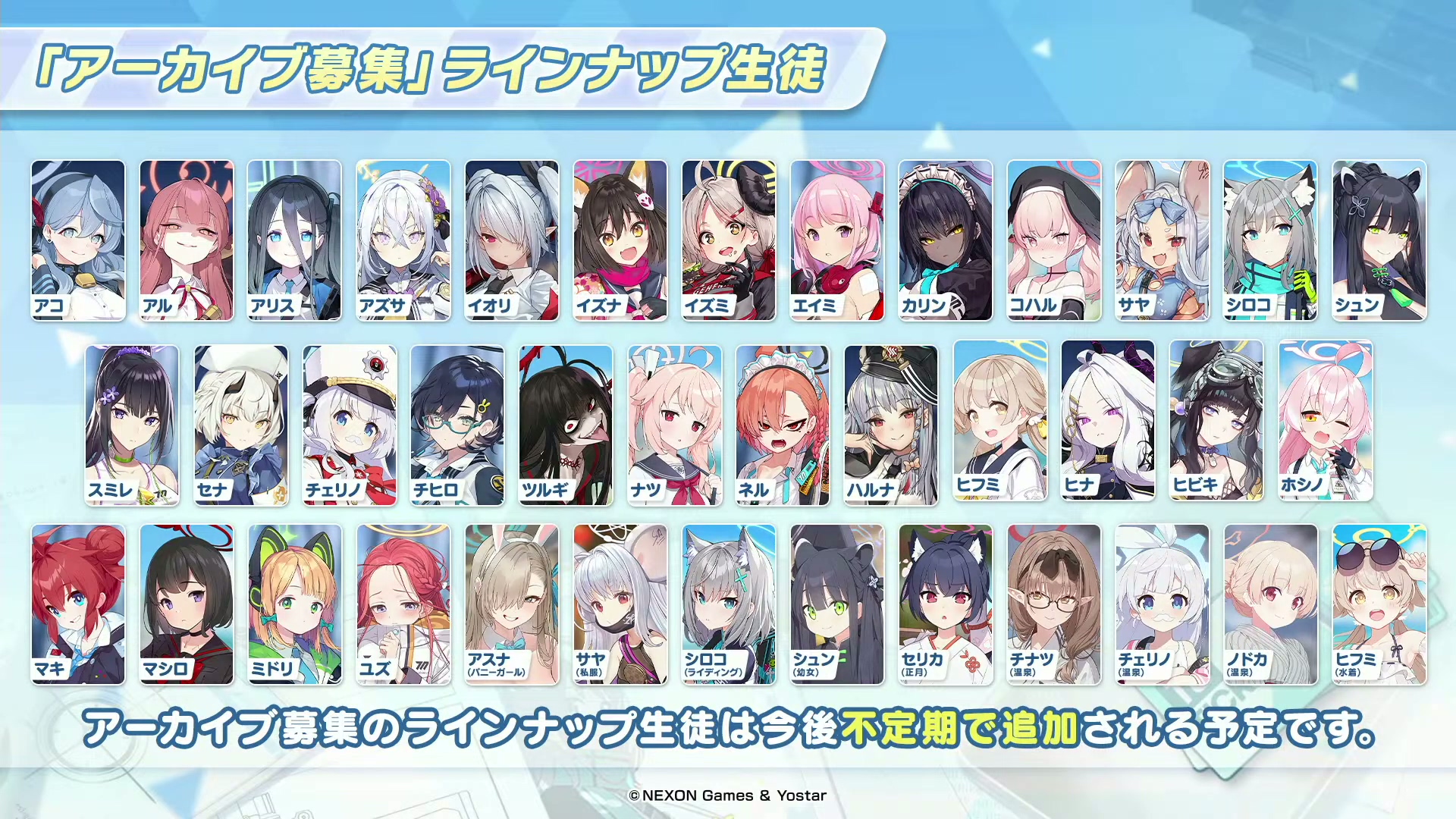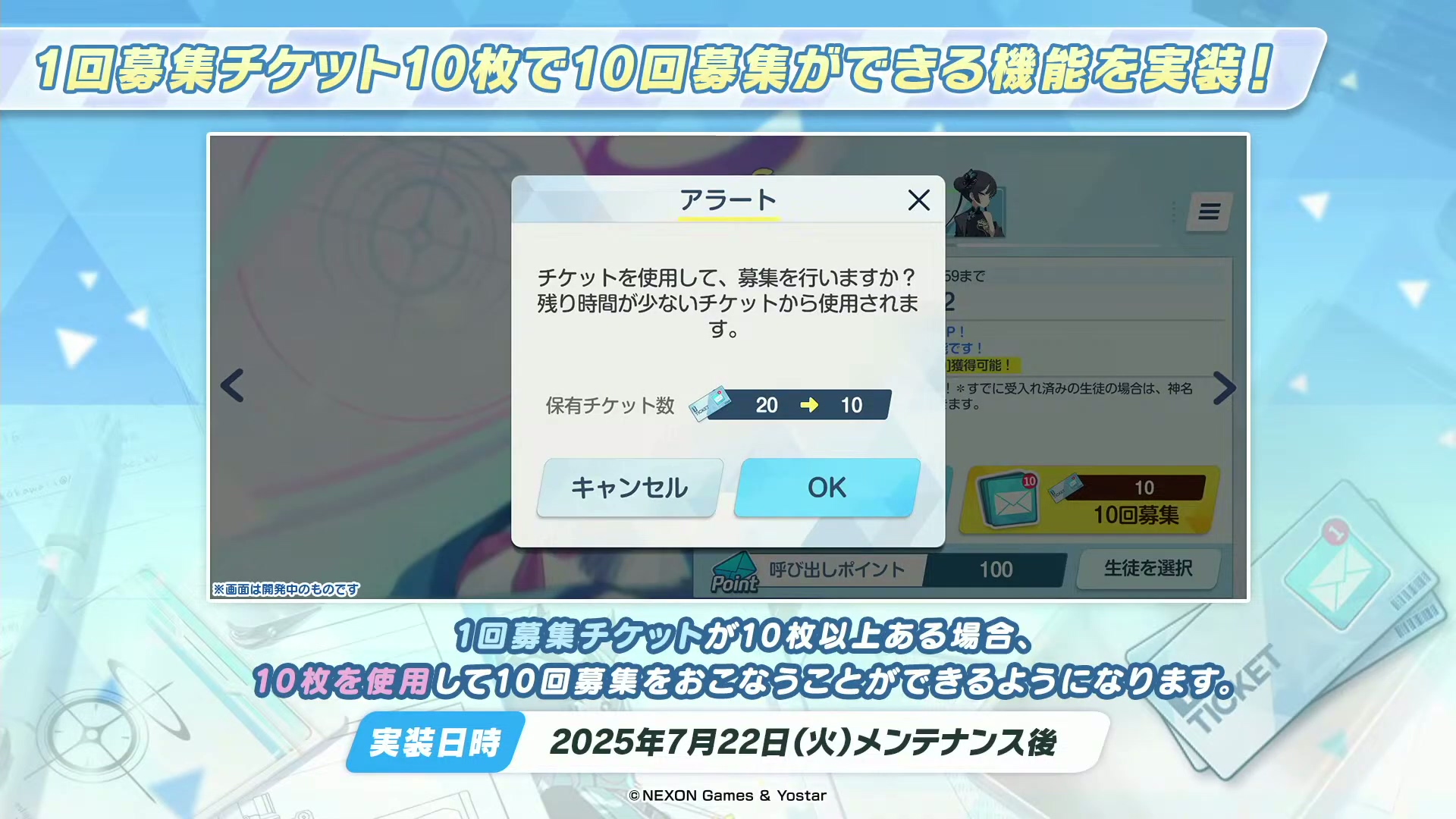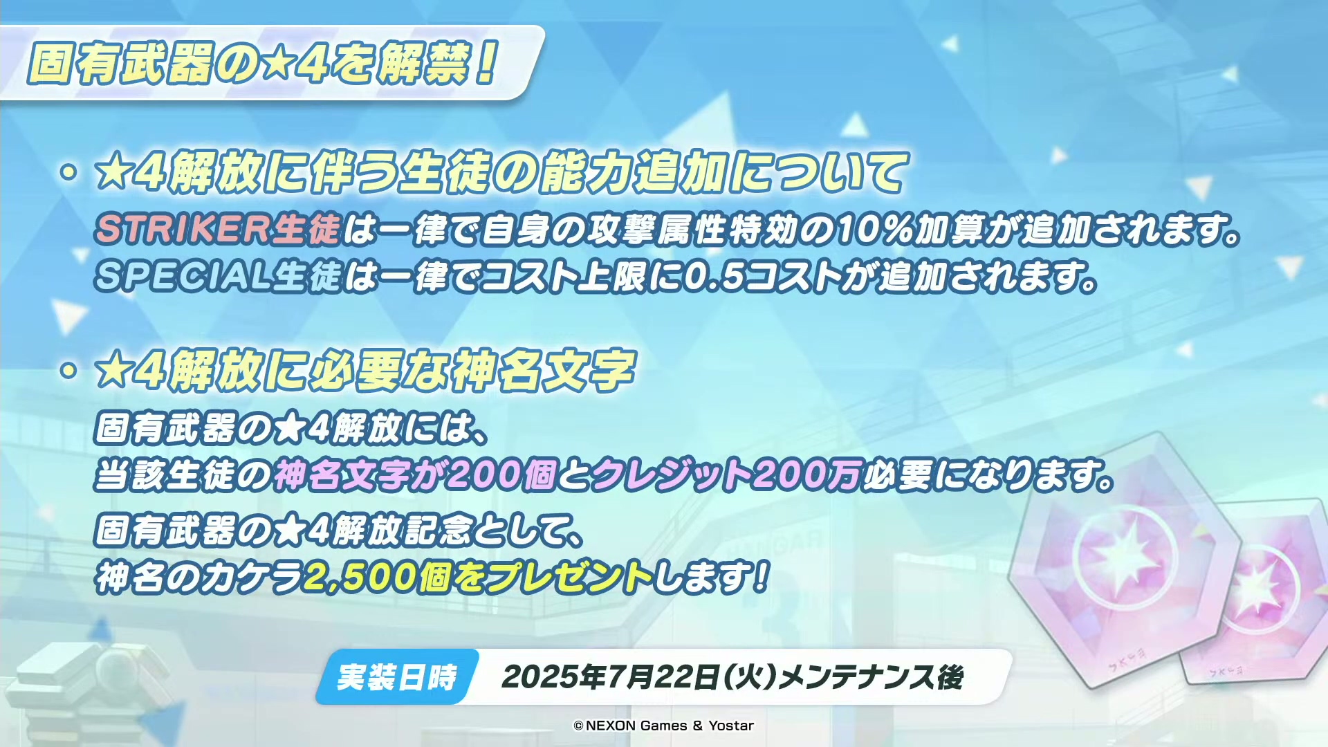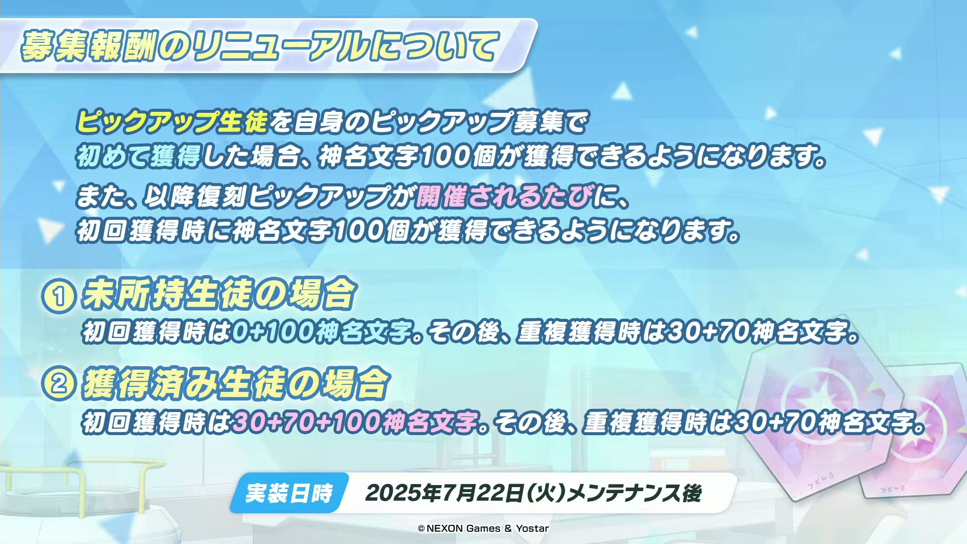 维护后,首次通过Pickup招募获得Pickup学生时,可额外获得100个神名文字
