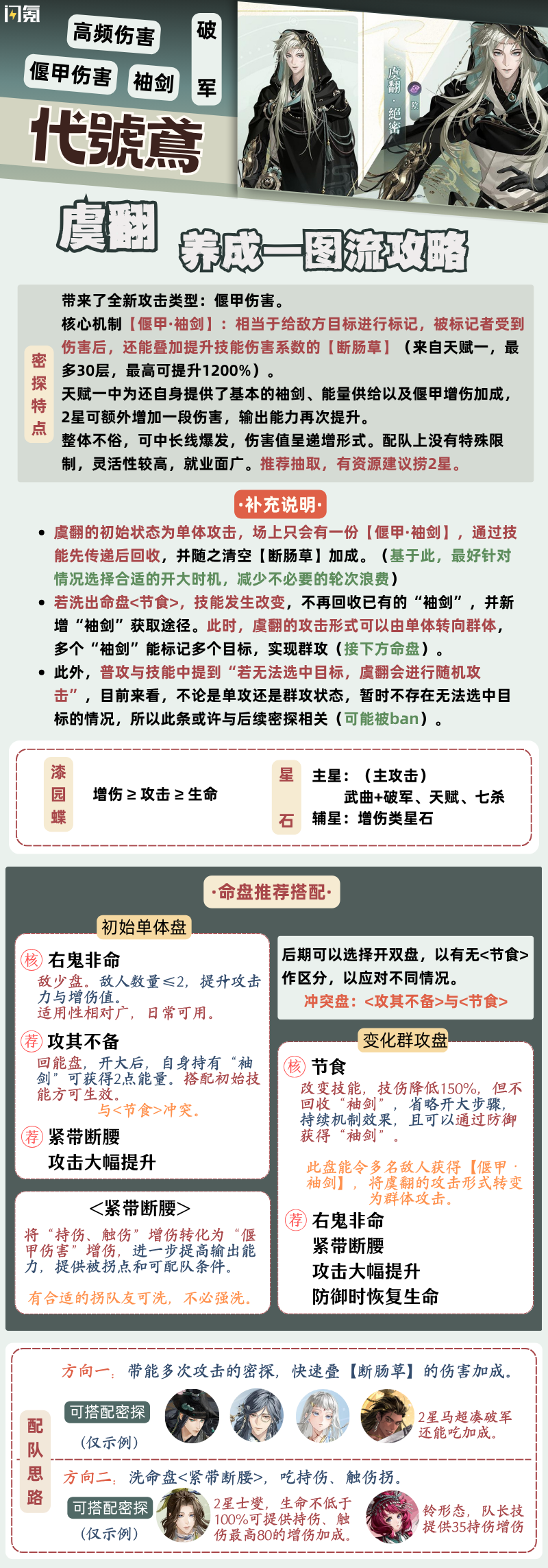 2星虞翻和命盘适配度更高,取消回收后,能保证敌人死亡前都持有【偃甲·袖剑】,可以稳定每轮行动后的额外伤害。