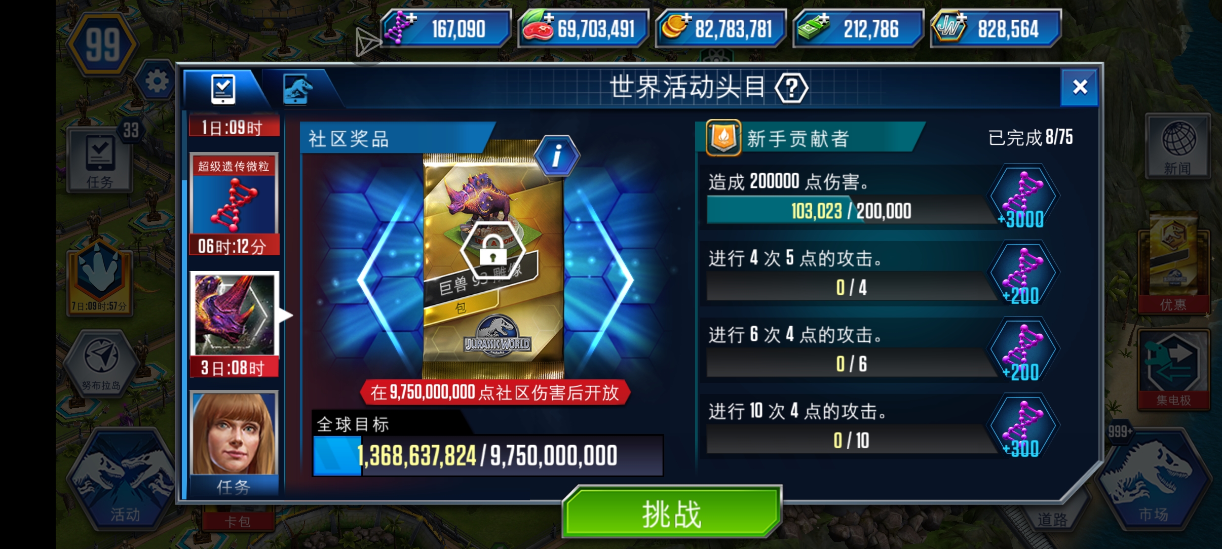 这个头目活动我已经记不清连续多少次没有领到雕像了,之前才玩的时候,我都是打一局,后面就能领了,为什么打一局,一是恐龙属性低,二是必须打一局,不然领不了奖励。现在我每次都打的,反而全服累计伤害打不满了,这究竟是打的人少,还是玩家减少,还是偏向于后者,毕竟出群体就够离谱了,现在的超级遗传物种,根本看不懂。