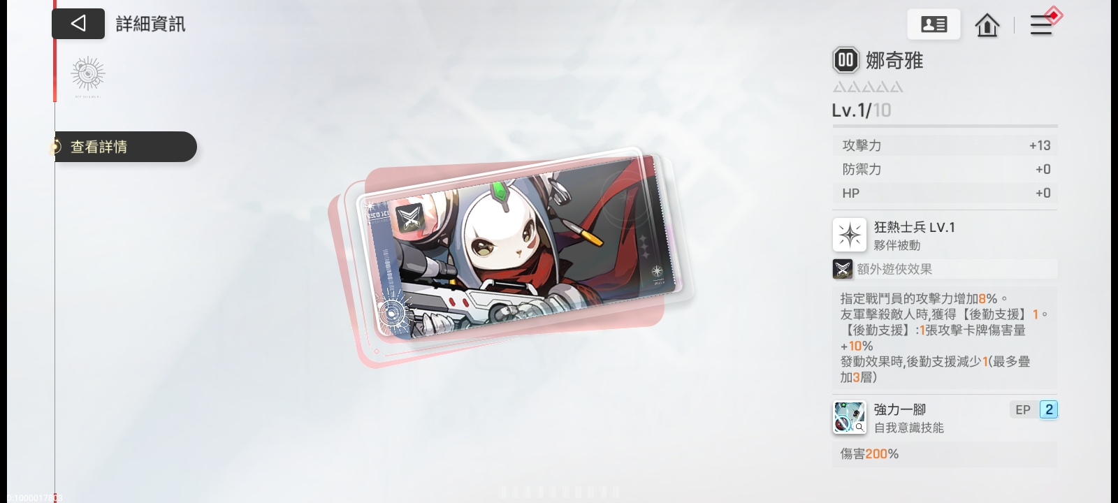 梅铃:决斗家,打弱点伤害的,数值不算太低,配合同伴技能的加伤buff食用更佳,给到 顶级