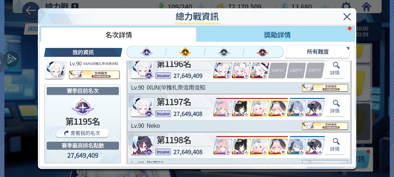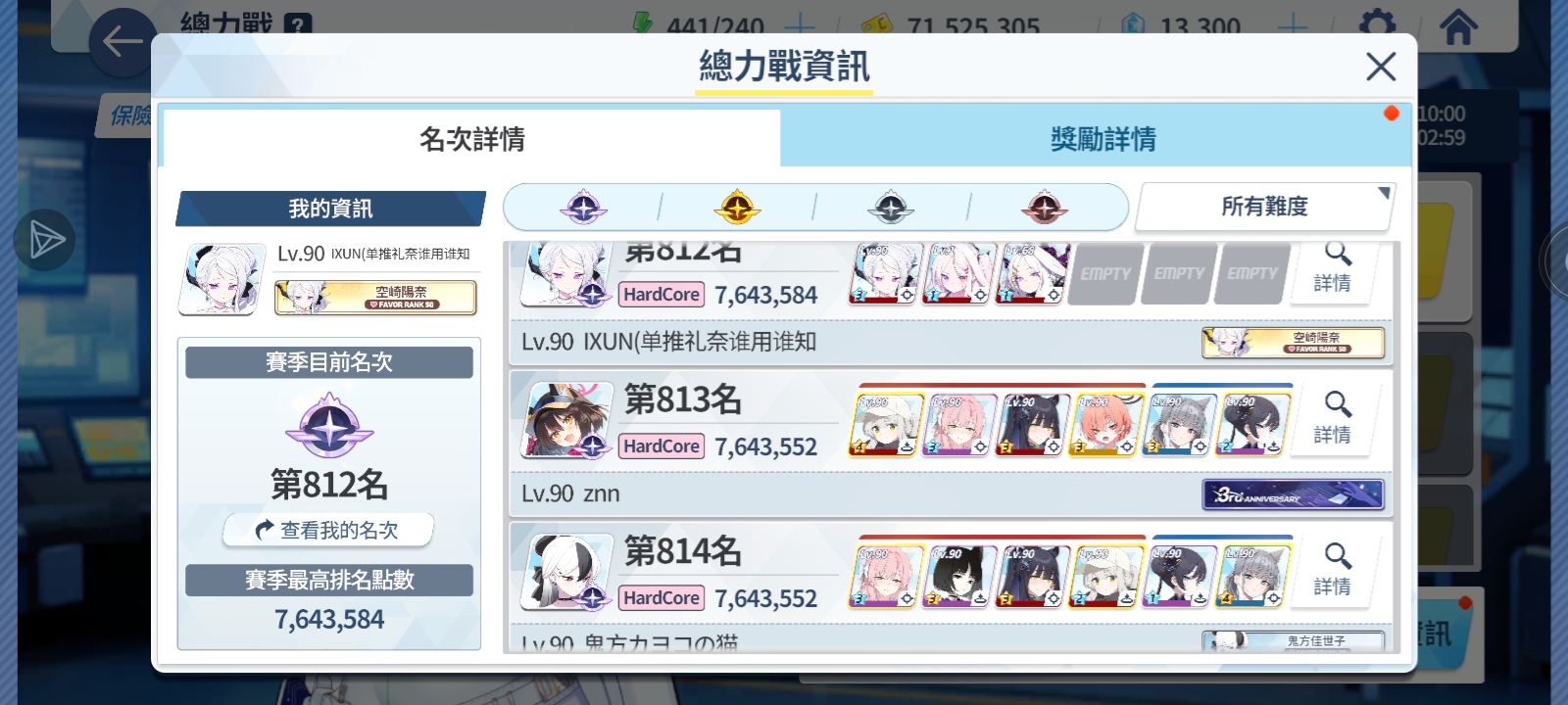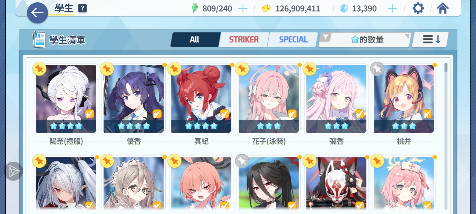 两年过去,我已经成为大家口中的大手子了,就目前已实装的角色,强度党必备的学生我就只差水白和轮椅了,戳我xp的限定学生但是没有的也只有飞马时和水知世了,其他的全部收入囊中了。目前学生是一百五十多位,还有五六个能用碎片换的我懒得换比如爱丽丝、响、夏之类的,一共加起来将近160位,限定三星角色40个左右,其中有联动限定御坂美琴。账号实力的话,在没有提前准备的条件下,无意间抽出一个必养学生,我可以现场把她拉到大差不差,差不多就是这个意思。目前只有一个51羁绊的礼奈和44羁绊的水日奈,普通日奈30多,计划在明年暑假结束前升到3个50羁绊。