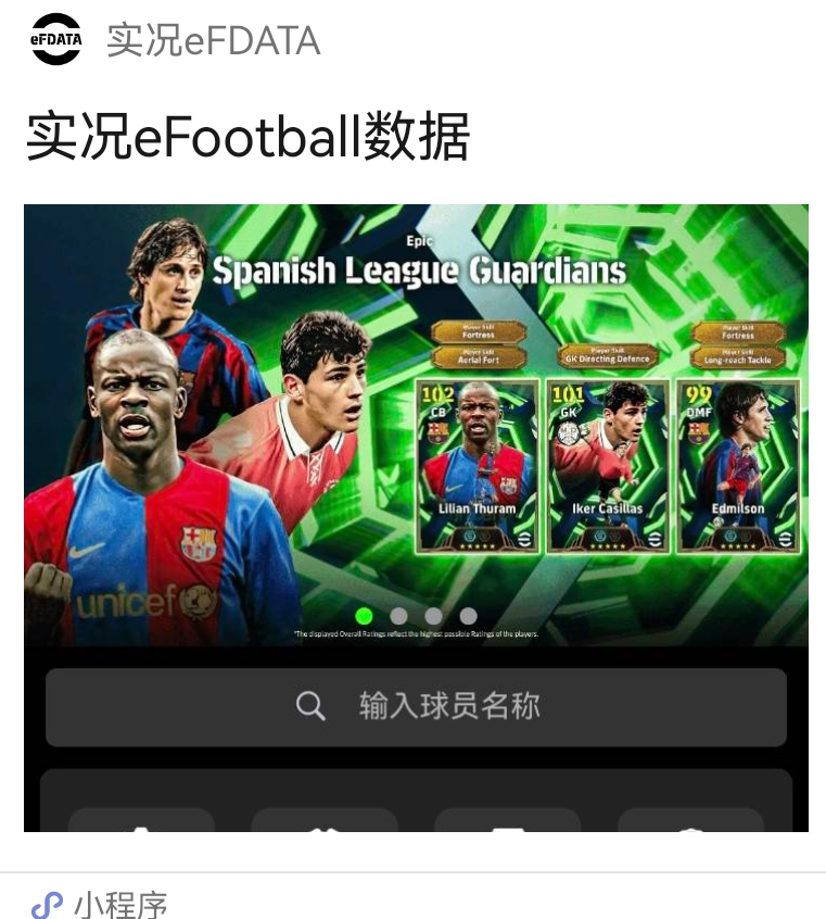 以下是“实况足球 EFData”小程序的详细功能介绍:核心定位一个强大的《实况足球》球员数据库、阵容搭配模拟器、球队管理与胜率分析工具。它帮助玩家从“凭感觉”玩游戏,进阶到“凭数据”进行科学决策。主要功能模块1. 球员数据库与查询这是最基础也是最核心的功能。· 庞大数据库:收录了游戏中几乎所有球员(包括传奇、时刻、标准球员等)的详细数据。· 精确数据:包括进攻、防守、盘带、速度、体力等数十项具体能力值,以及球员技能、风格、模型(身高/体重)等。· 高级筛选:你可以通过多种条件组合来“淘球员”: · 位置:精确到中锋、影锋、左、右边卫、中场、后腰、中后卫、边后卫等。 · 球员风格:如“偷猎者”、“虚假跑位”、“全能中场”、“破坏者”等,这是搭配阵容的关键。 · 能力值范围:例如,筛选“速度 > 90, 射门 > 85”的前锋。 · 球队、联赛、国籍:用于组建队套。 · 球员技能:筛选拥有“插花脚”、“单触传球”等特定技能的球员。2. 球员对比分析· 功能描述:可以将2名或多名球员放在一起,直观地比较他们的能力值雷达图、关键数据和技能。· 用户价值:帮助你在两个相似球员(例如,两个“偷猎者”中锋)之间做出选择,看看谁更符合你的战术需求。3. 阵容搭配与模拟· 功能描述: · 阵容编辑器:你可以在小程序内模拟组建你的理想阵容,拖动球员到各个位置。 · 阵容化学/默契度计算:自动计算你模拟阵容的整体默契度(队徽旁边的数字),并显示每个球员因教练、队友关系获得的默契度加成。 · 成本计算:显示组建这套阵容所需要的总经验卡、GP(游戏币)等。· 用户价值:在消耗资源购买或培养球员前,先进行“沙盘推演”,避免浪费。