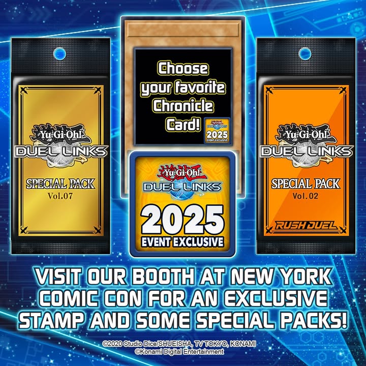 在#NYCC领取#游戏王决斗链接奖励!前往KONAMI展位#2219获取特殊代码,即可获得2个游戏内卡包和专属活动印章,用于装饰你最爱的编年史卡牌。