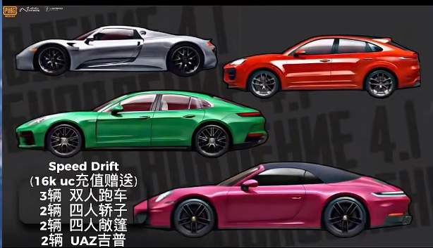 PUBG保时捷具体车型公开,4.1冰雪主题,(备注我只知道跑车的讯息和家园,因为从小的时候接触后跑车后就慢慢喜欢上跑车,喜欢跑车的轰鸣声!其次特别喜欢摆设这些,开上跑车其实也是我的梦想,那就带着我的梦想去远航最后开上科迈罗(变形金刚电影里的车型)