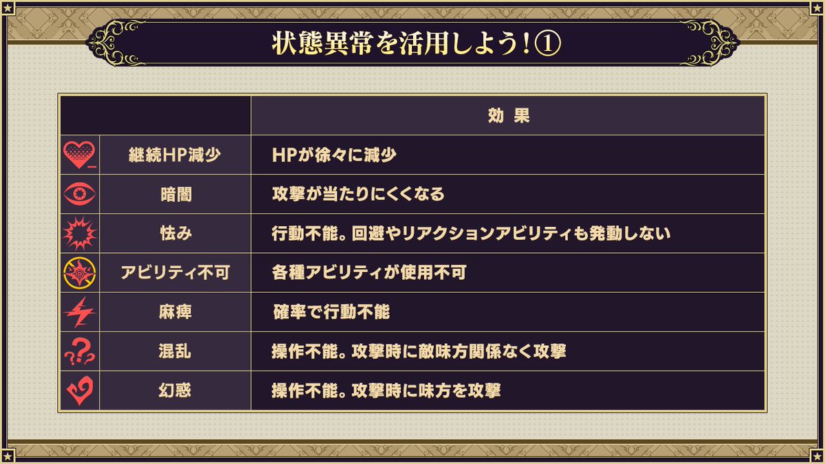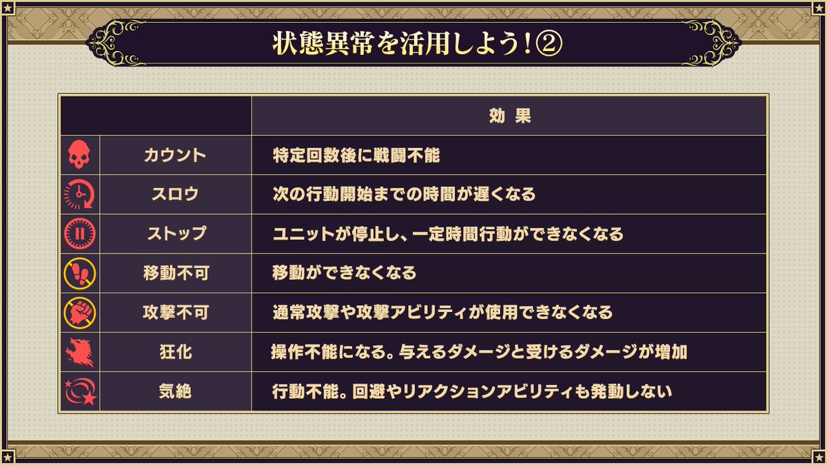 战斗中,通过单位技能或支援技能等可能会引发状态异常。