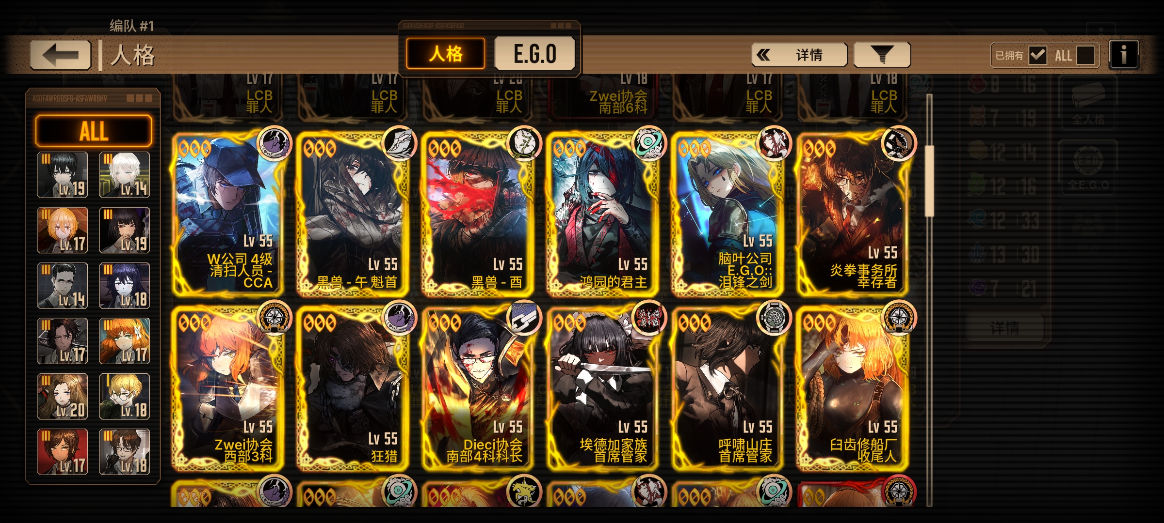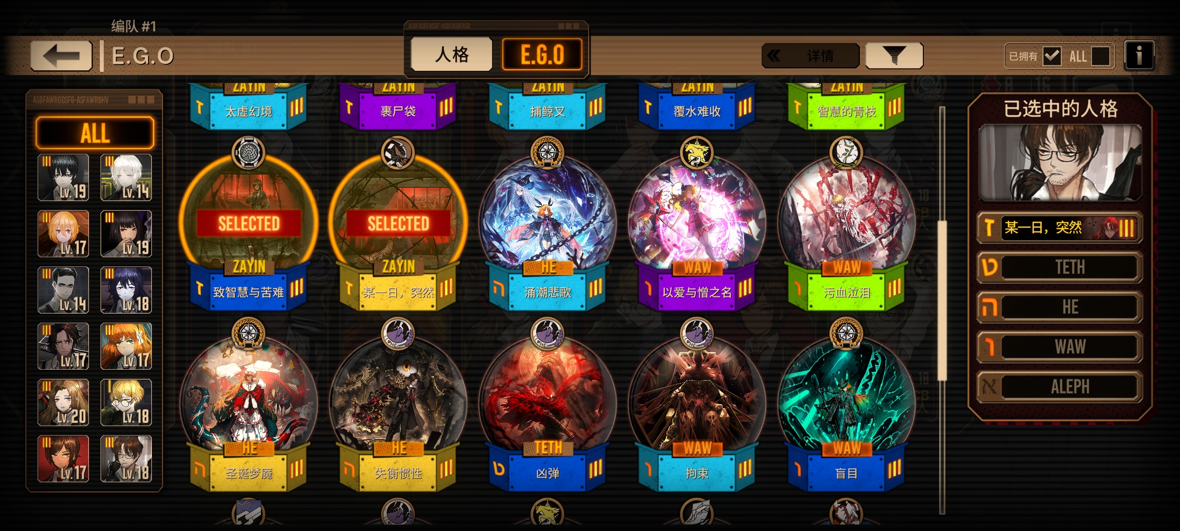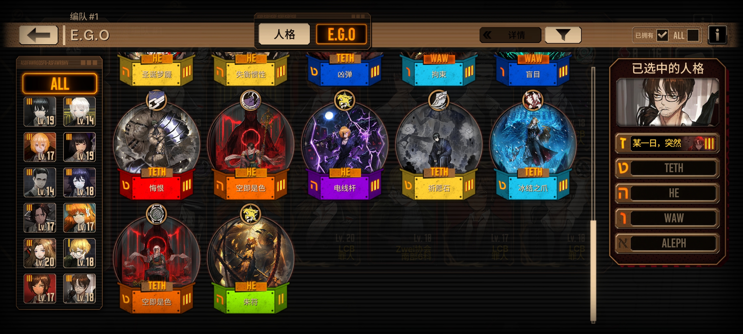 这些是我主要用的角色和EGO,我有400鸿路人格碎片,我是等到通行证结束换污血泣泪-始,还是换句点宝,我现在正在攒浮士德人格,也快400碎片了,我没有三灯浮士德,应该换哪个,反正我的狂气不支持我抽瓦夜,而且新的人格我也不是太想要