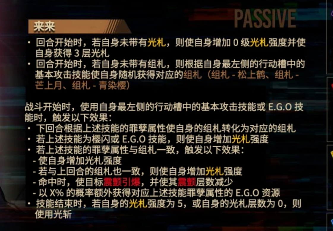 但是,相同罪孽属性的ego是可以代替123技能触发抽牌的,也就是出千强行抽牌。也就是说,只要你第一回合抽到了3技能且凑出了可以放一发捕鲸叉的资源,花札玛第二回合就能放个强化四给你看。