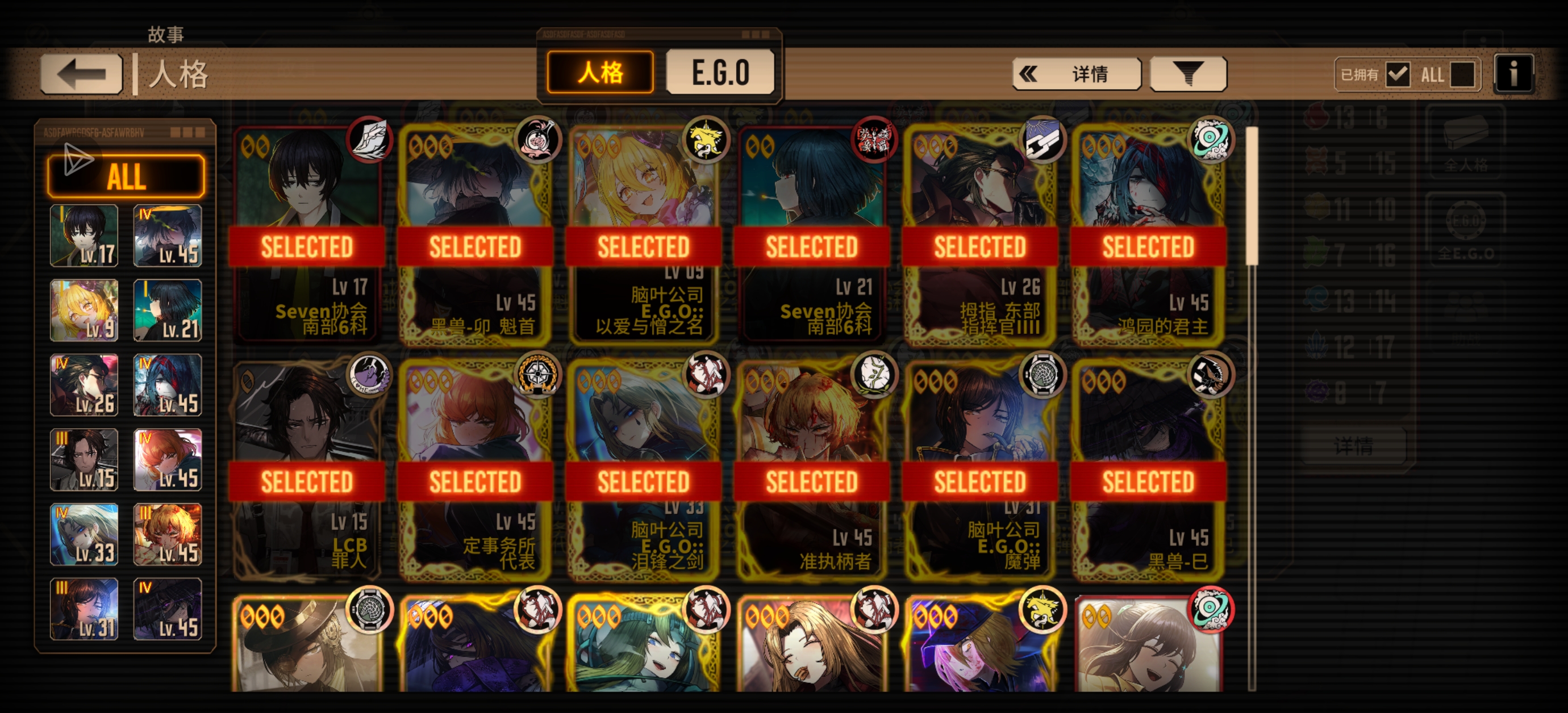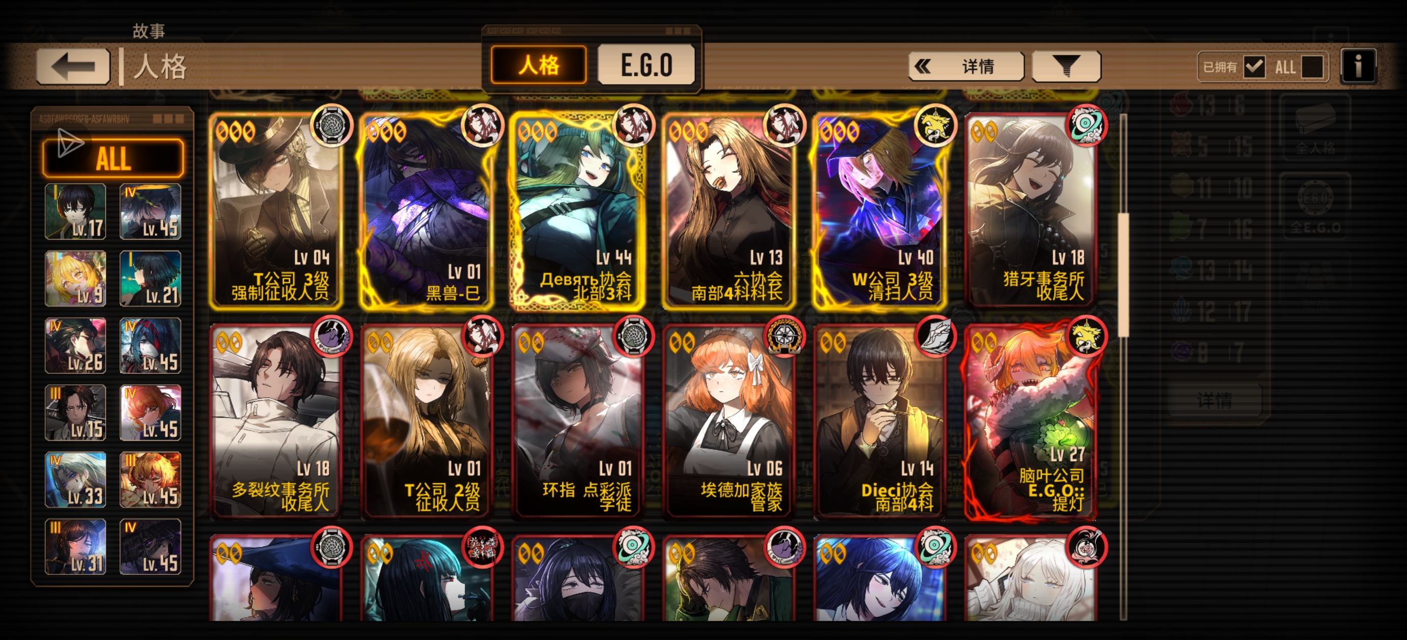 小登听说跟方舟联动入坑来的,结果捯饬半天入坑发现联动都结束了,但是因为看了好多视频感觉很喜欢,还是接着玩了(自己刷了好几个小时抽了个兔浮开荒),到现在已经有挺多人格了(看攻略先抽、换了一堆菜刀),就是没啥ego(感觉也无大所谓后面抽瓦夜随缘爆吧),然后现在有些疑问想请教大家,让大家给点建议。
