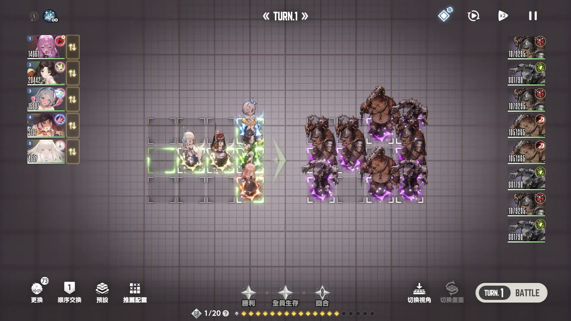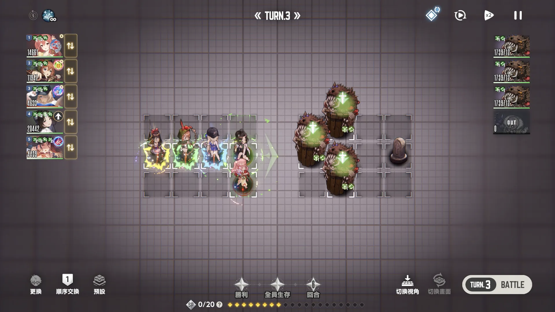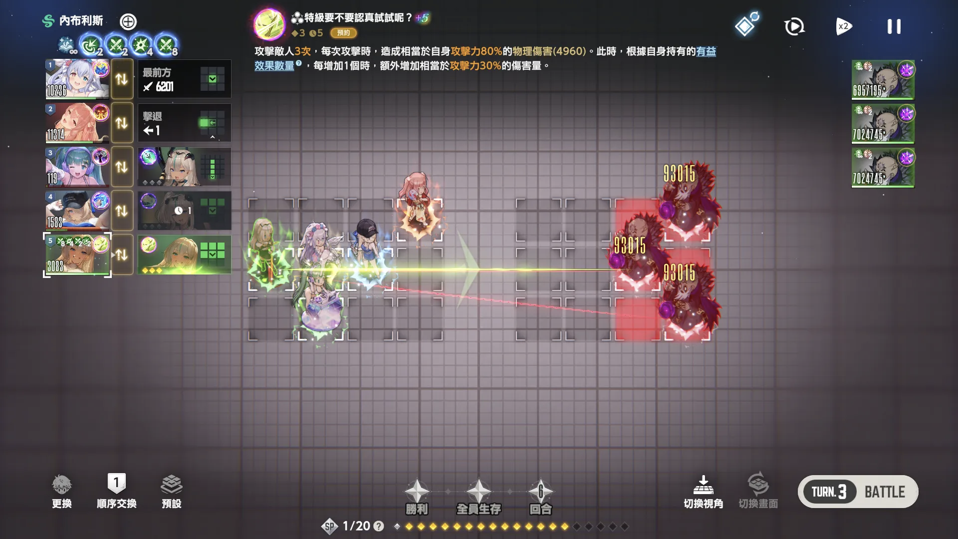 第一回合内布利斯第一顺位先手泳装后队友再上buff,第三回合ol凹暴击一波带走。(全员堆魔抗,不然会被秒)