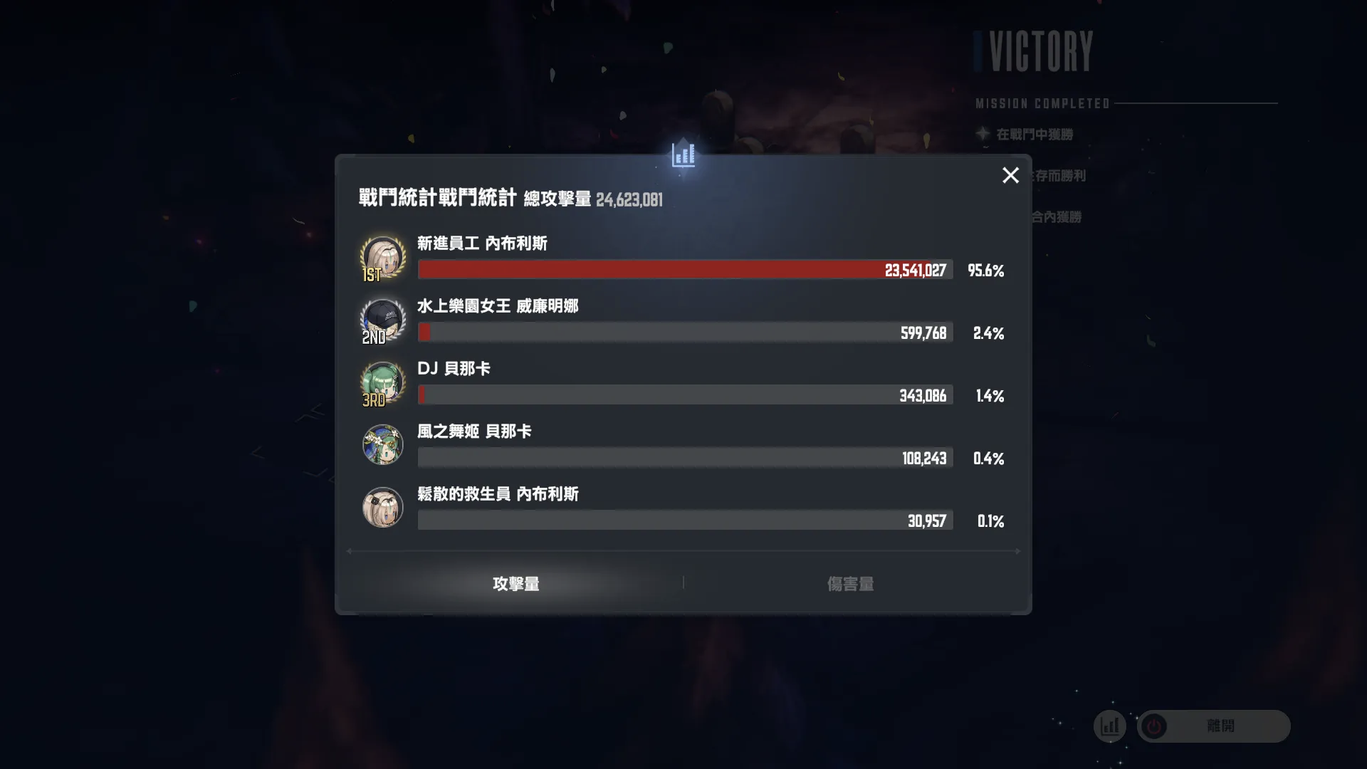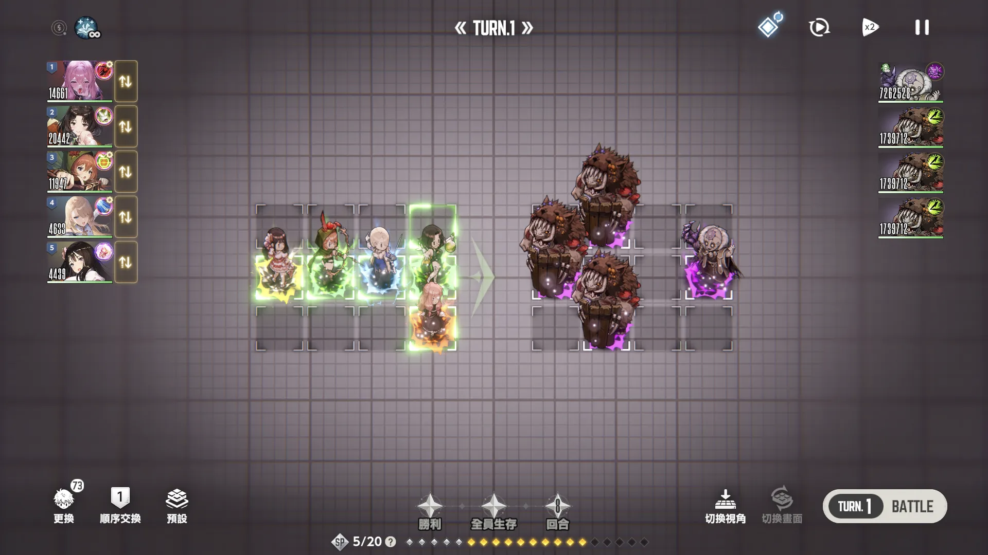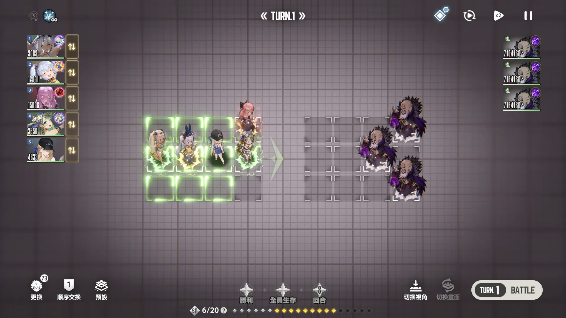 第一回合内布利斯第一顺位先手泳装后队友再上buff,第三回合ol凹暴击一波带走。(全员堆魔抗,不然会被秒)