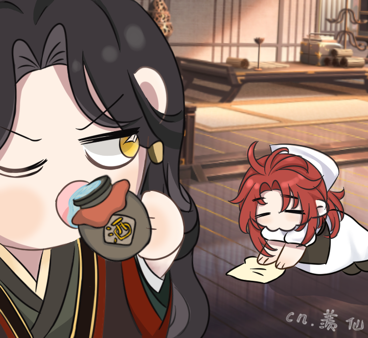 诶!终于有人发现了吗🤓👆68手里的酒不是酒,上面的字是洒,确实是假酒哈哈哈哈。至于小酒坛子我画的时候没想过他干了什么事反正就是让他爹生气了,你这么一说确实诶👍