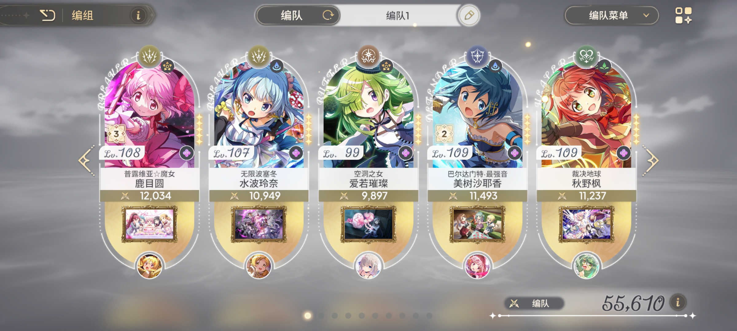 你没有安排输出的角色啊!你弄俩个buff或者是debuff替代大圆和爽哥。圣麻美强度没那么高,一个奶妈够了