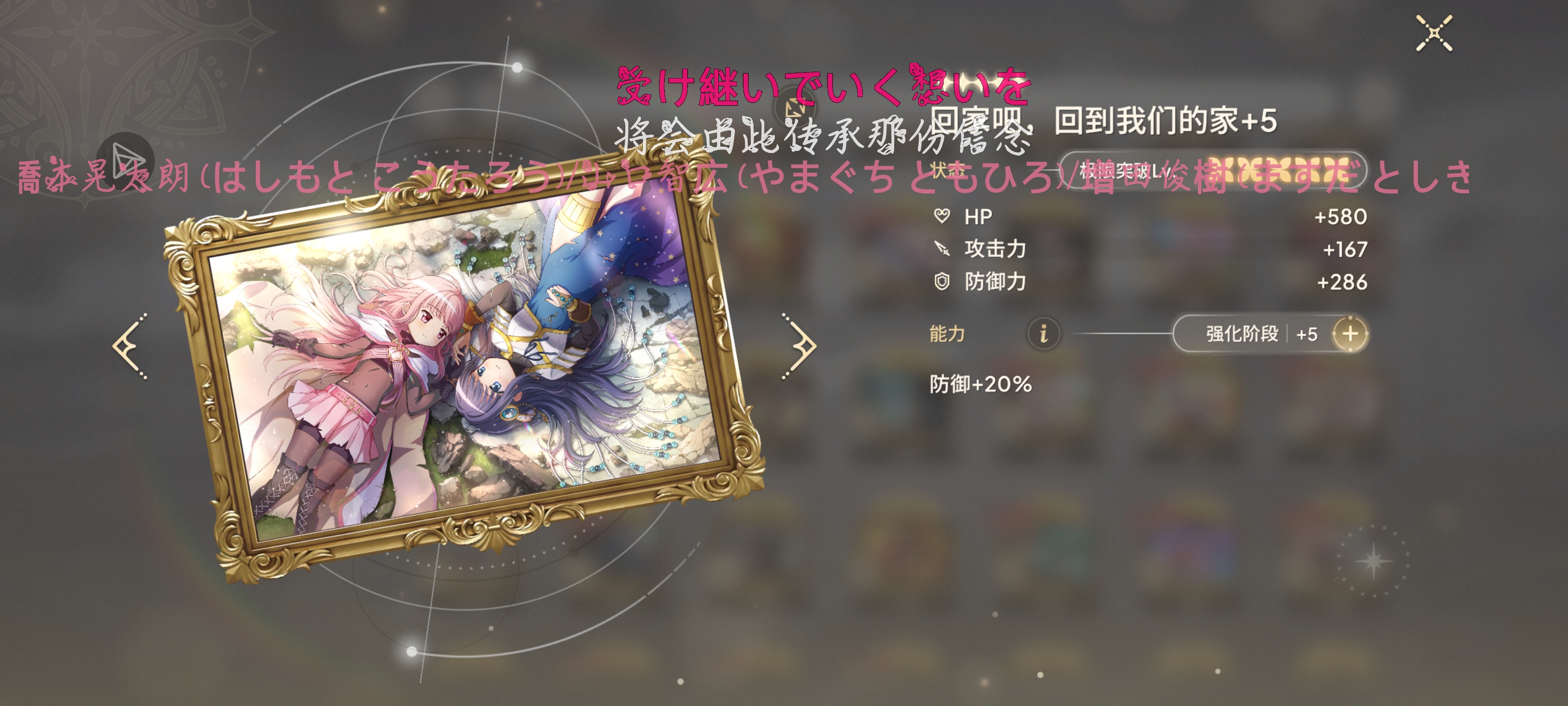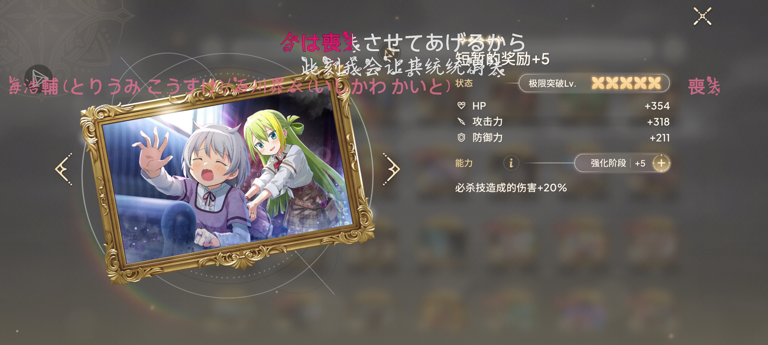奶妈:千岁/辅助:叶月/盾:粟根心/破韧位:相野(可换其他破韧位比如桑水)/输出:加贺见真良(选真良是因为破韧200以上有追击)(可换其他四星主c)
