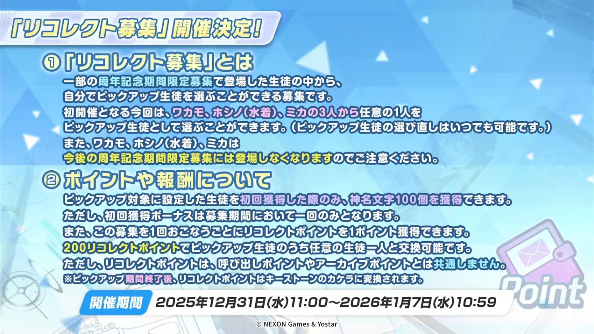 追忆招募结束后,追忆招募点数将会转换为供心石碎片,且提到的三位学生在往后的周年庆庆典招募里无法获得。