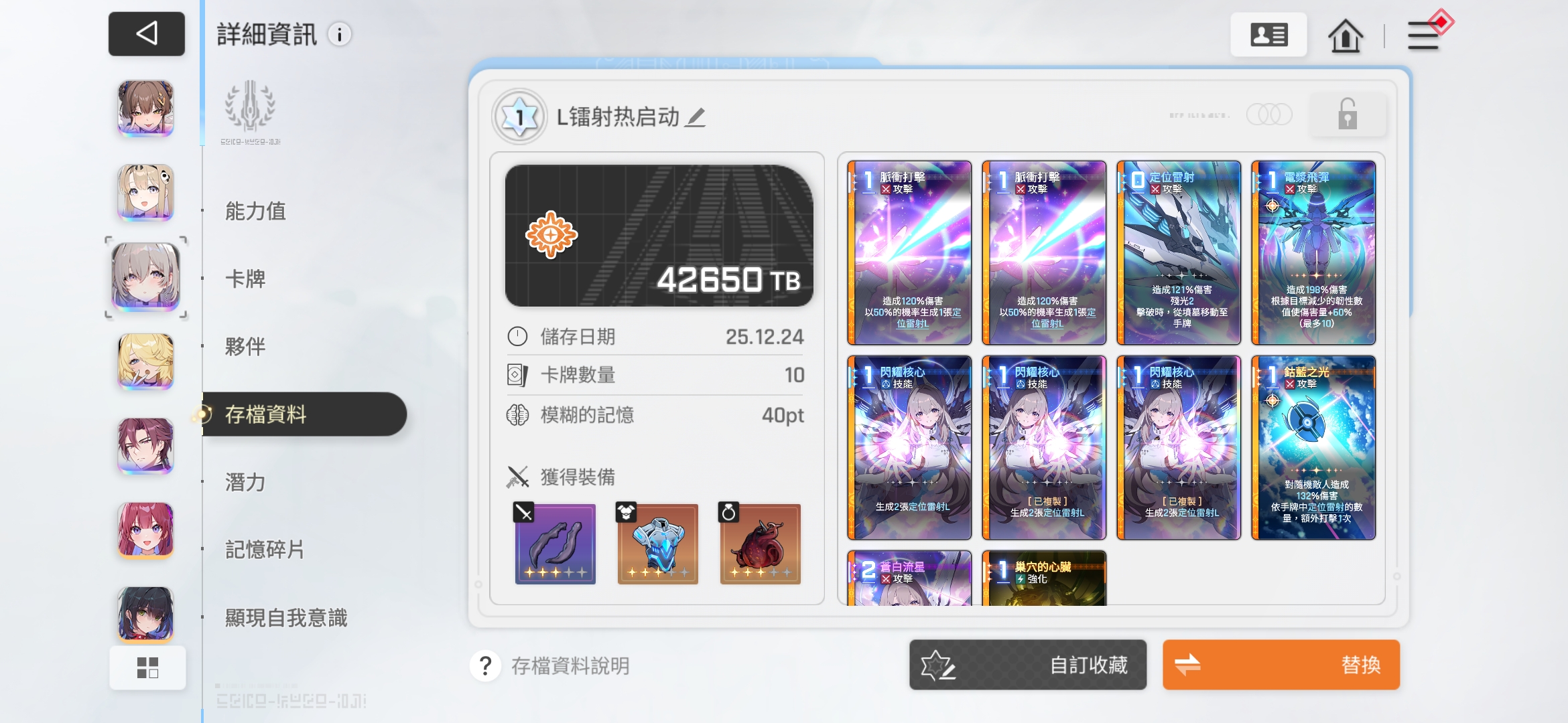 这次的限定角色是真限定,物有所值。网上主播也都给出基本资料了。但我要补充下,装备方面一定要注意,虽说都可以带但是要明白你是爆发流还是平推流。如果是主打拿奖励,那么注意我图中第三个装备,击破后下一张加100%伤害。这个在第一张昆虫副本最后BOSS概率掉落。看好我卡牌里的钴蓝发射是闪的1费爆发,我复制三张核心,配合过牌队友,不用依赖大招就可以击破后满镭射回手牌,这时候启动钴蓝,攻击数量和伤害都是爆炸的,直接一波地毯轰炸。这一点大家可以试试,这件装备网上很多人都没研究过,当然,感觉这个角色后面会有更多流派开发出来,技能书相当丰富。