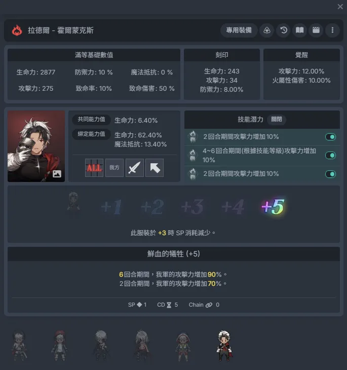 霍尔蒙克斯拉德尔:俗称“铁面具”,+3时-1sp,提供全体攻击力Buff,游戏中最高的攻击力提升,但仅限前两回合,剩余回合效果会降低至一半左右。+5时Buff回合数由4→6,可全程保持增益效果。