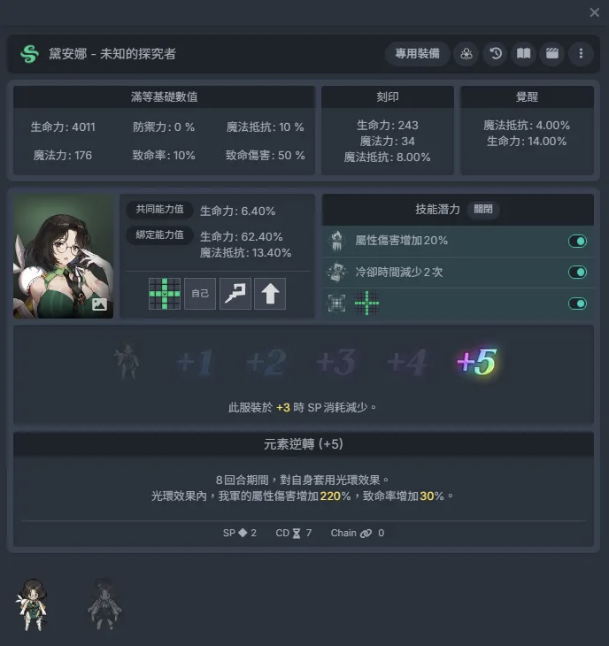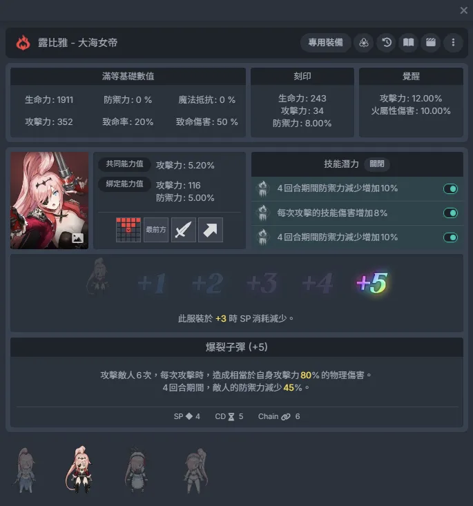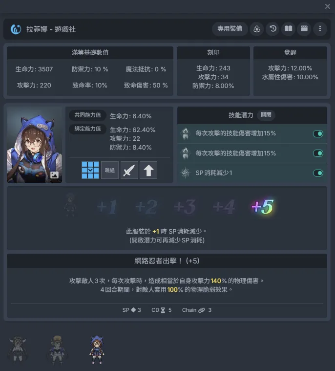 游戏社拉菲娜:+1时-1sp,九宫格物理脆弱。和莱维亚一样都是+2和+4时会进一步增强脆弱效果。前期+1/+2,后期一般+4就可以了,也可以拉满。
