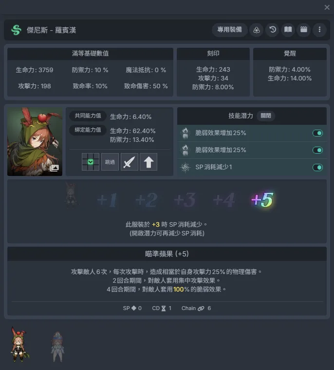 罗宾汉杰尼斯:+3时-1sp,再加上潜力可以来到0sp消耗,非常灵活,不管是PVP还是PVE都非常好用,集中攻击+脆弱效果,经常配合连锁队上场,前期开个图鉴,中期追+3,后期+5拉满。