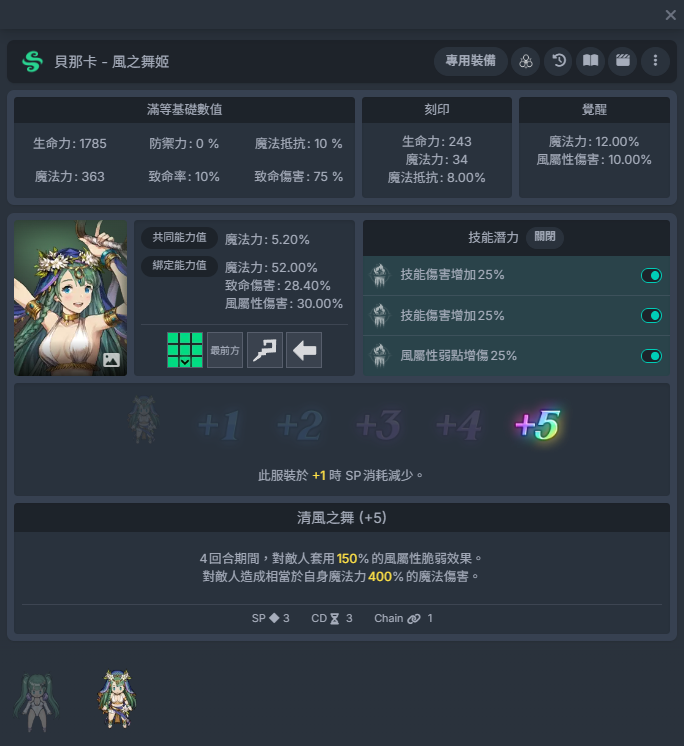 风之舞姬贝那卡:+1时-1sp,九宫格风属性脆弱,配合B海和免费送的+5狐狸推图好用,酒馆可招募一个。+3时脆弱值来到最大,比较有性价比。四个红标角色里优先级最高。