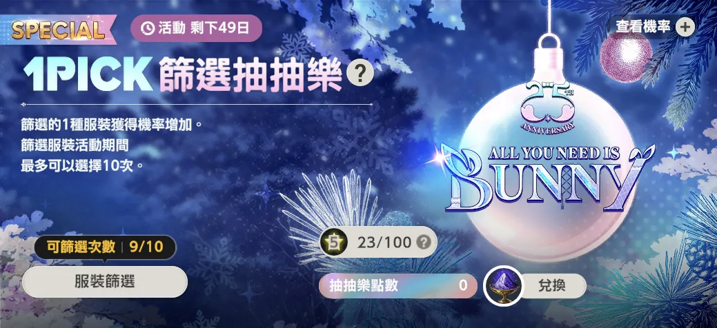 所选服装每个几率0.25%,可以用紫票或红票抽(建议是优先紫票,红票留着)这个池子就比较适合新手玩家。
