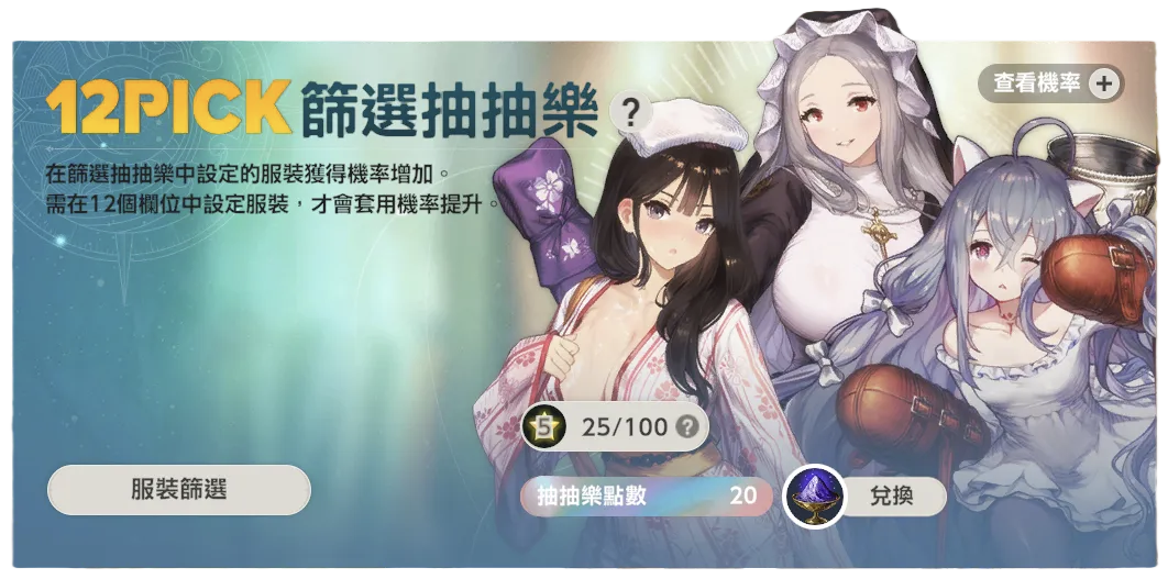 12pick跟1pick算是各有优缺点吧,12pick只有100保底那次有几率会歪,其他时候肯定能抽到你选的。1pick会歪,但是满200抽可换,有次数限制,比较适合急着补一些特定服装。不推荐新手去抽1pick池,还是选12pick比较好。