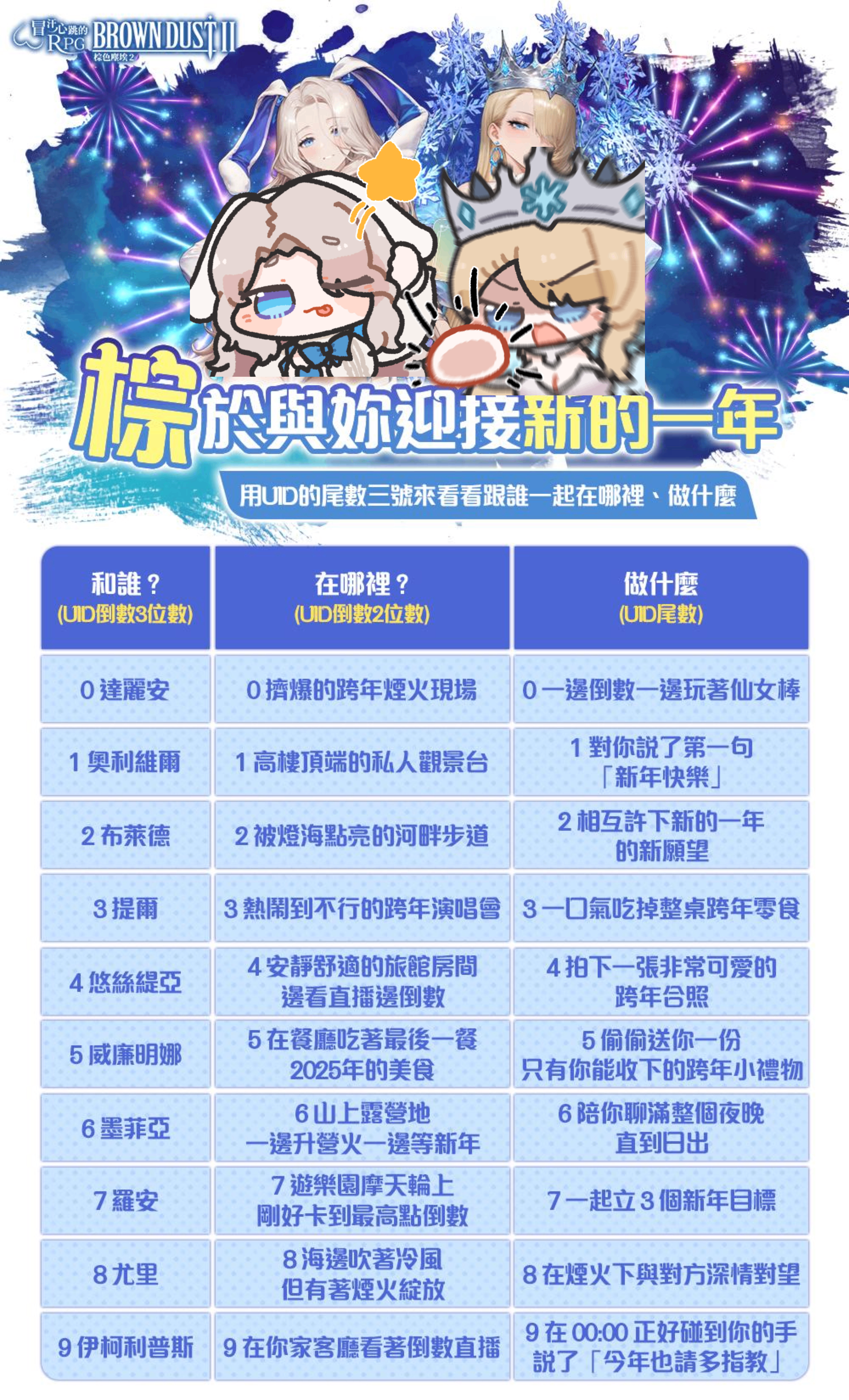 即将迎来新一年开始,这一次,让 UID 帮你决定—— 陪你迎接新年的那个人、那个地方、那个瞬间正在做的事!你的UID是跟谁、在哪里、做什么呢(>///<) 快留言分享吧!
