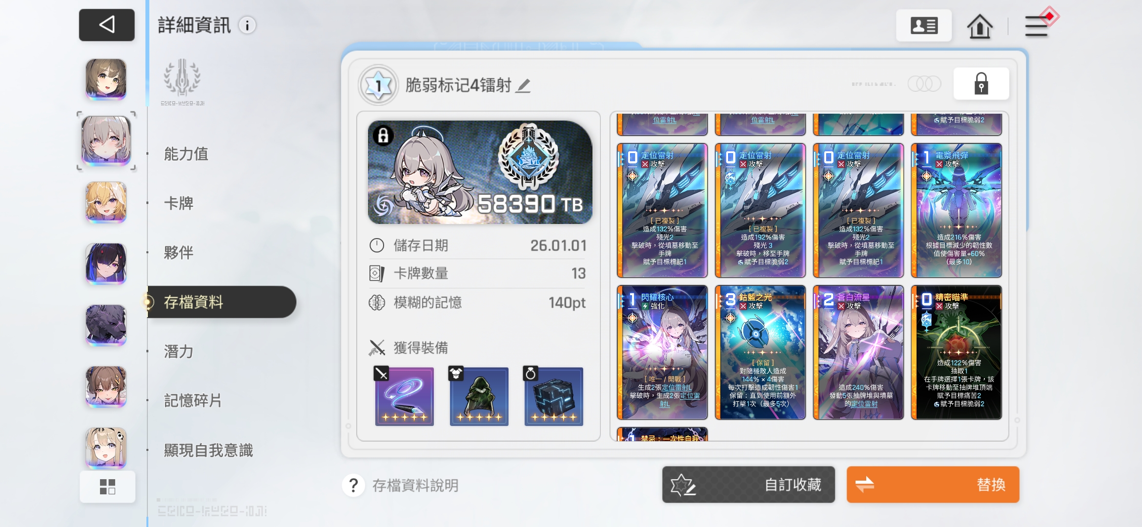 装备运气不好不用看了,只看卡组重点:脆弱,标记特性。首先优先复制蓝色镭射,稳定性强于L镭射且神闪可以附加易伤BUFF,在场外BOSS战里击破次数有限没那么多小怪给你续击破,爆发的伤害就很重要。而且苍白流星激发的蓝色镭射也会附加特效,加大循环覆盖。4张以上建议抽个1命增加打击效率。同时,蓝色镭射复制可以增加你的抽卡能力,当然需要抽到2命天使,摸到镭射触发一次抽卡。这也是为什么大家都说2+1天使性价比最高的原因。