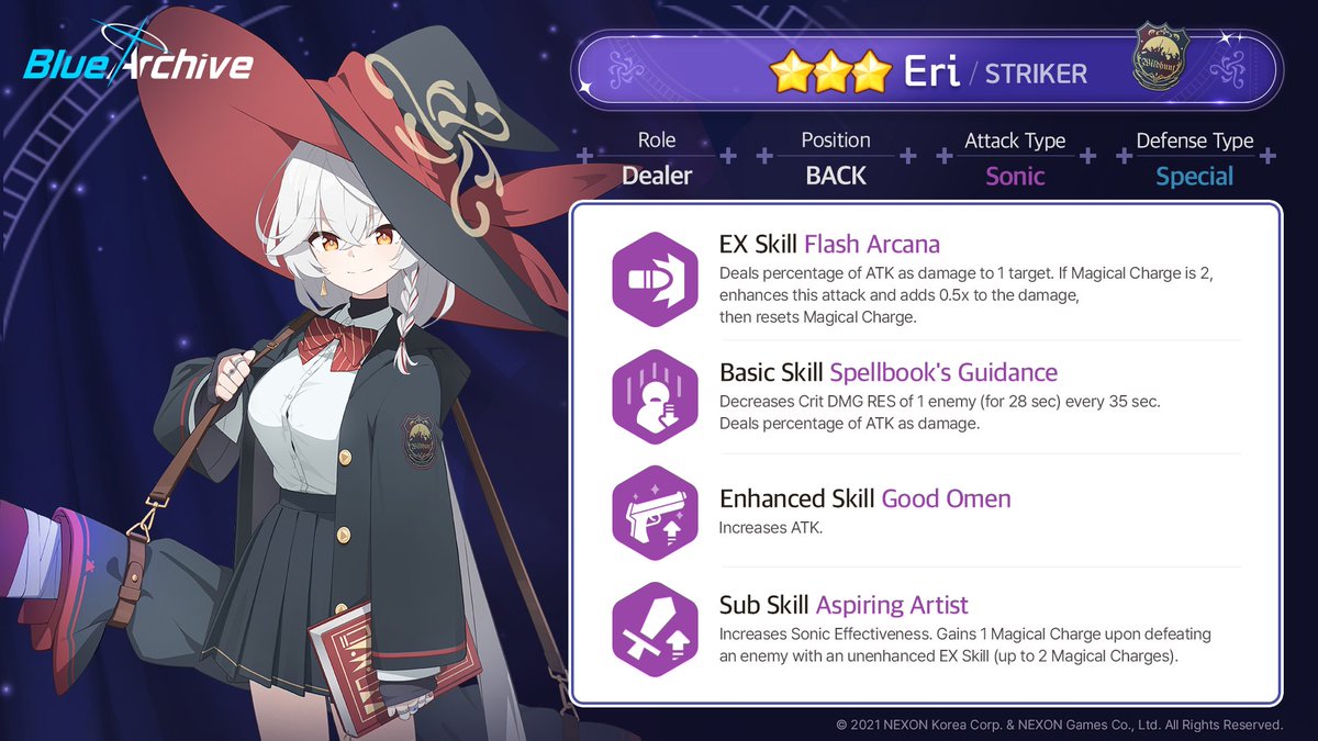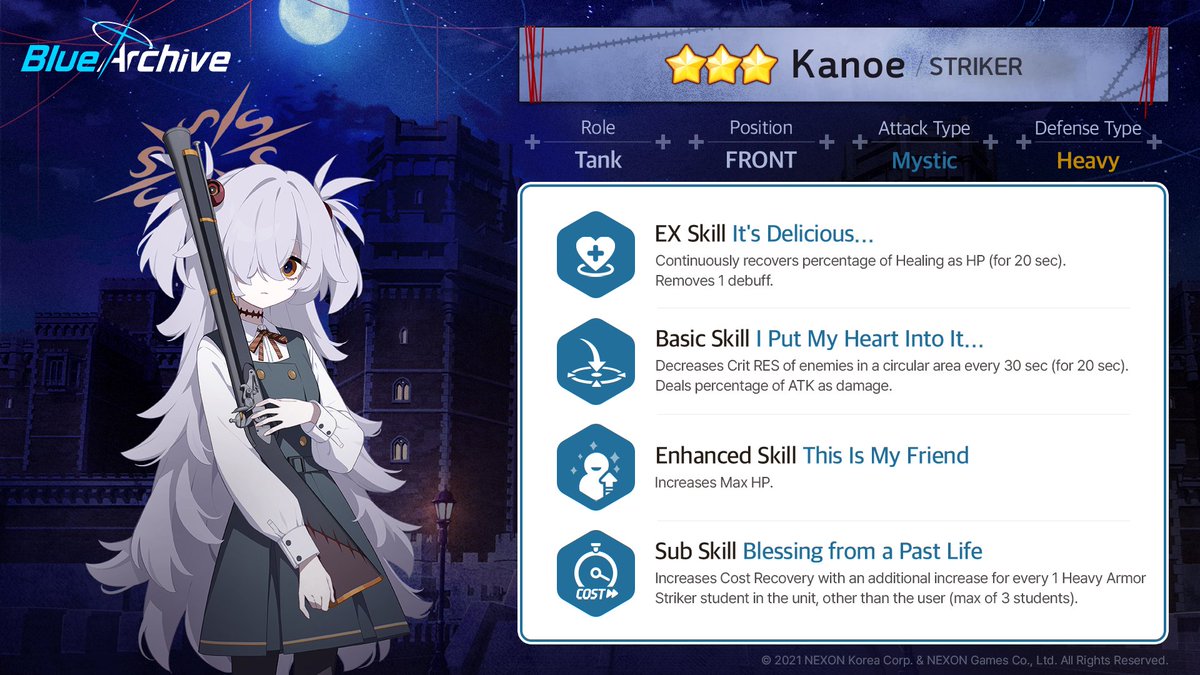 提升费用恢复速度;队伍中每存在1名除自身外的防御类型为重装甲突击学生,额外提升Cost恢复速度(最多生效3名)。