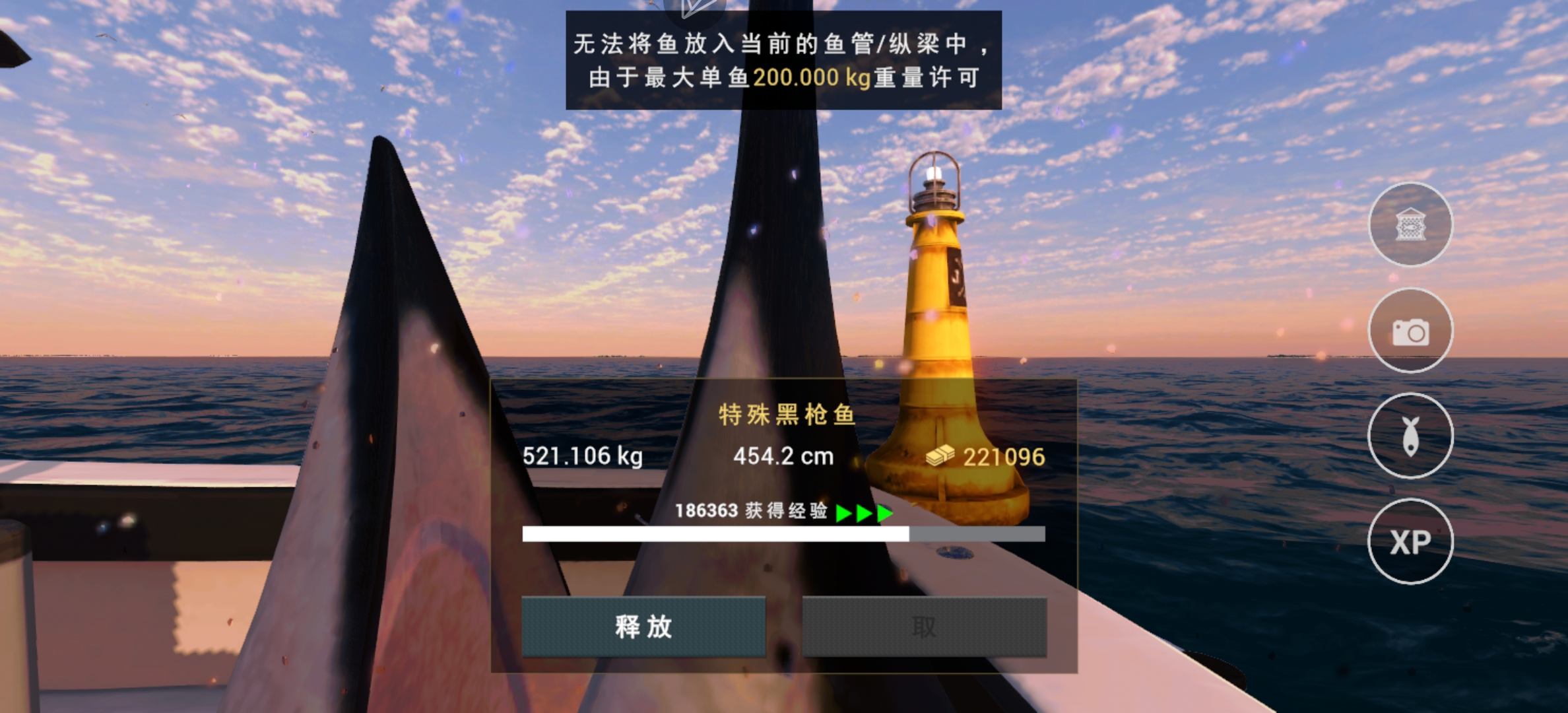 鱼太大了装不下,只能放生。到海图了,没好友一起玩,任务也做不了了,就当单机玩吧😅