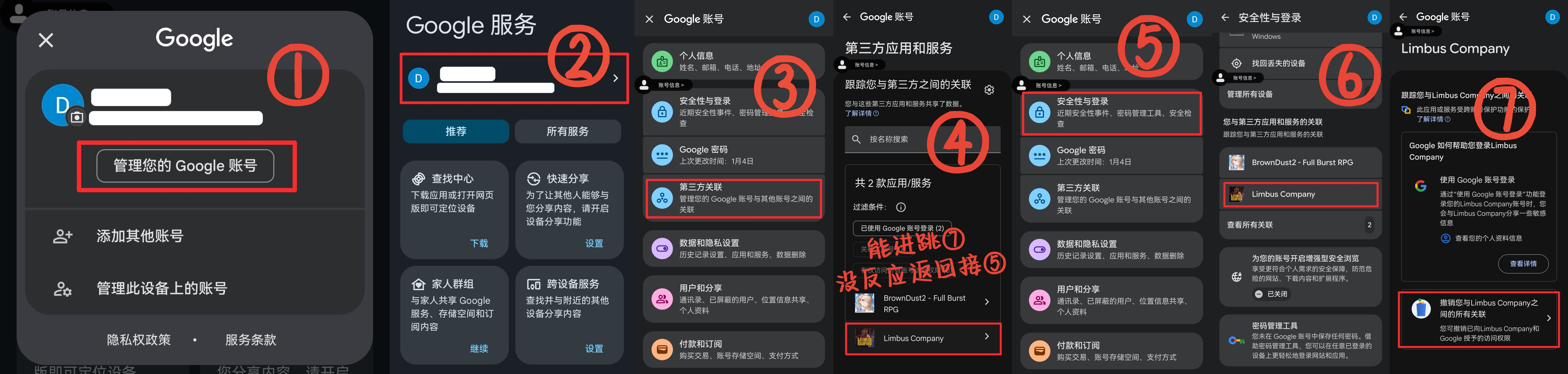 注意:①冷却期7天是指在边狱巴士中停用账号或解除绑定开始,期间不能登录这个账号,登录视为取消停用或解绑②有的人在停用或解绑7天后提示Link Failed,只要确认期间未登录原账号,那大概率是未在谷歌账号中撤销授权。③重新绑定提示Link Failed不会延长冷却期,失败后请去谷歌按下图撤销授权,撤销授权也不会延长冷却期。
