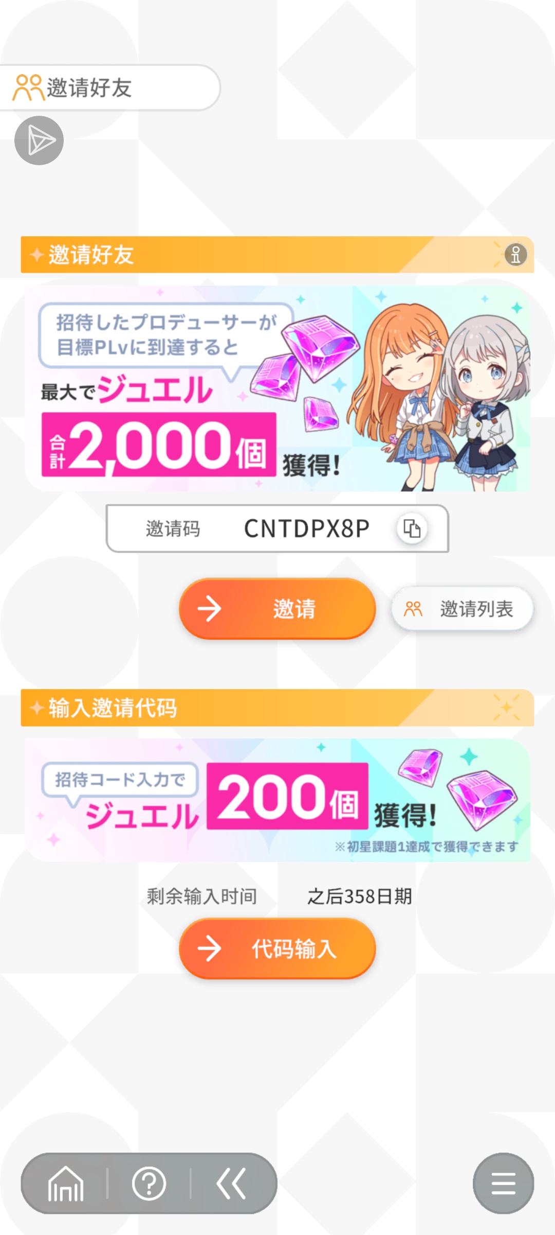 在朋友一栏,点击左上角“邀请好友”就可以输入邀请码一起拿钻石了