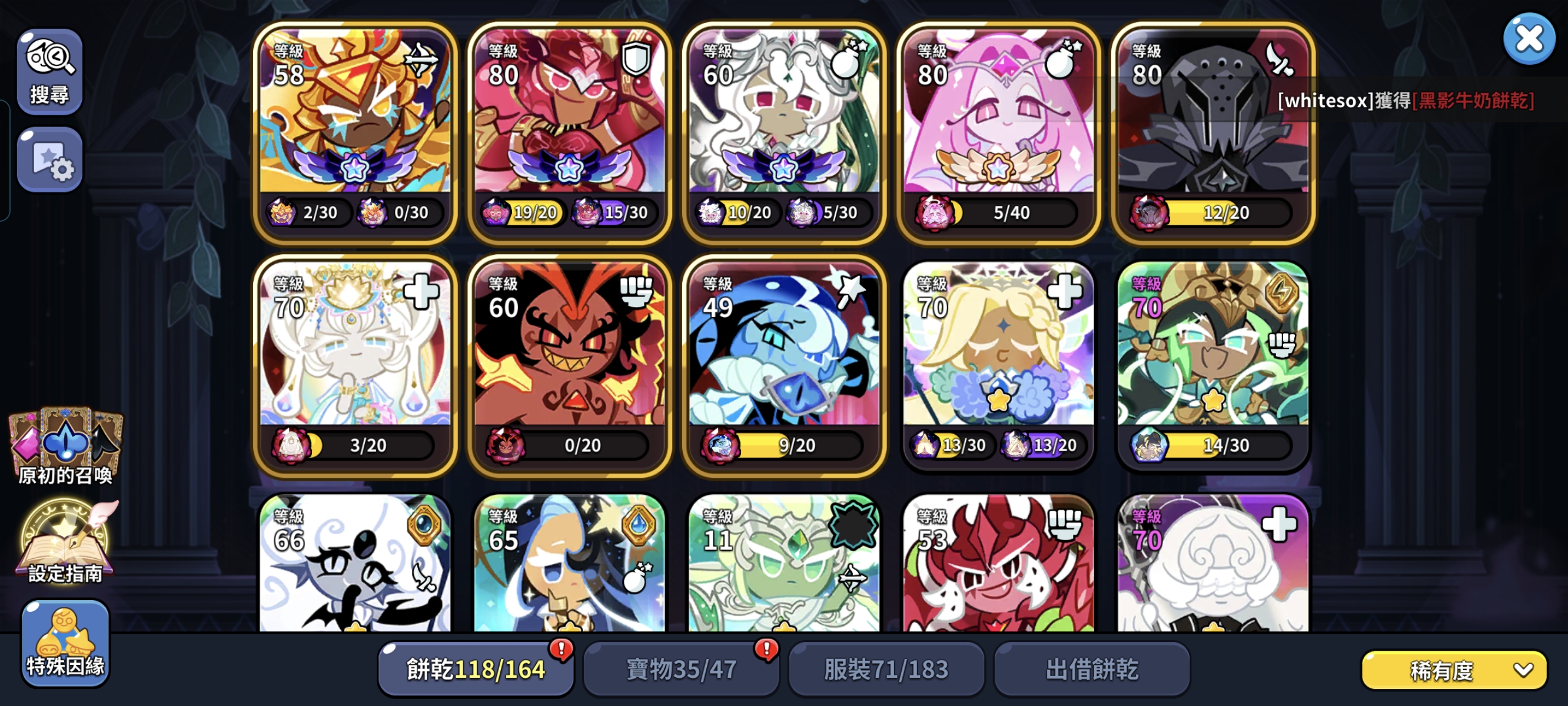萌新,加油肝吧!这号该有的关键饼干也有了,可以玩的更爽了,抽那个肚皮肤最好有50抽以上再抽,这样至少可以把那里的东西都领了,祝你在50抽以内拿下当期皮肤