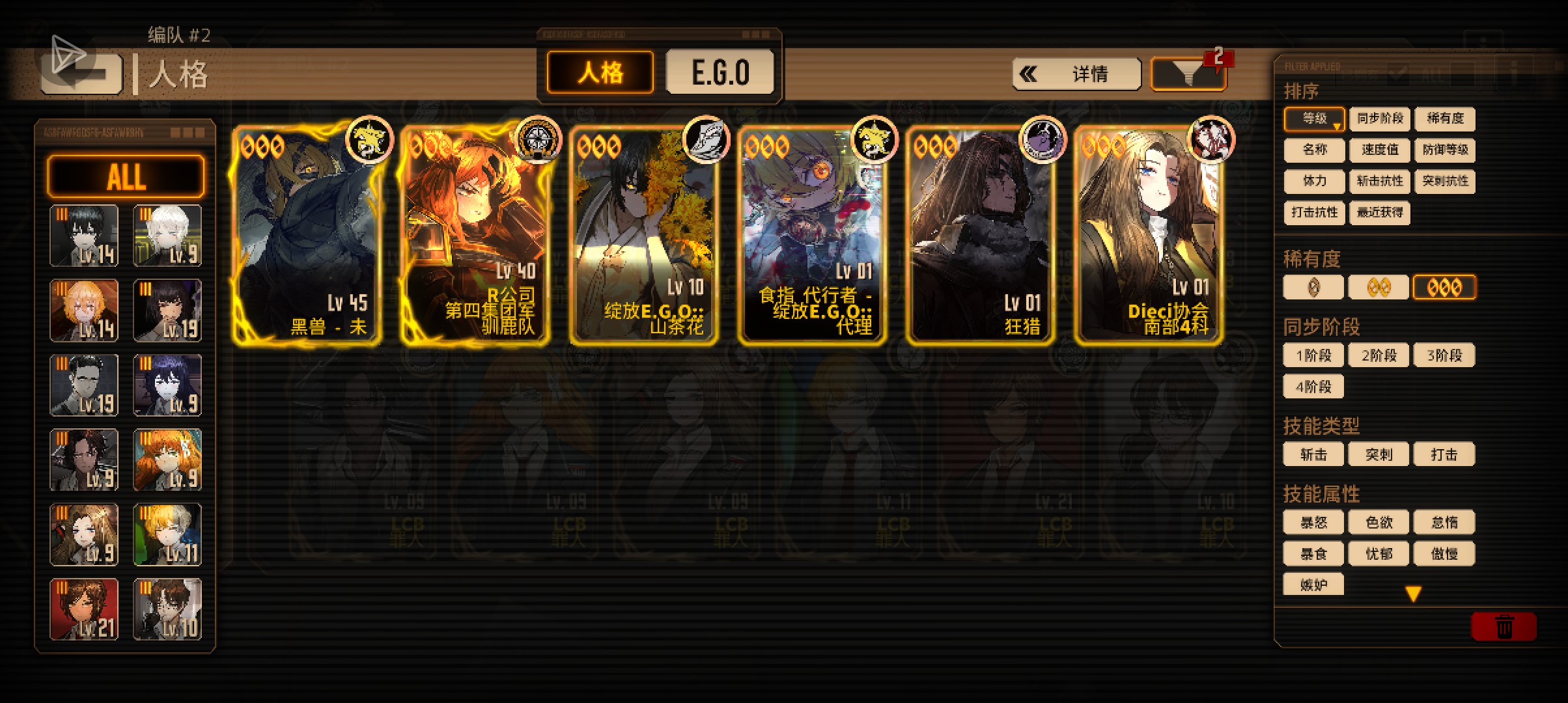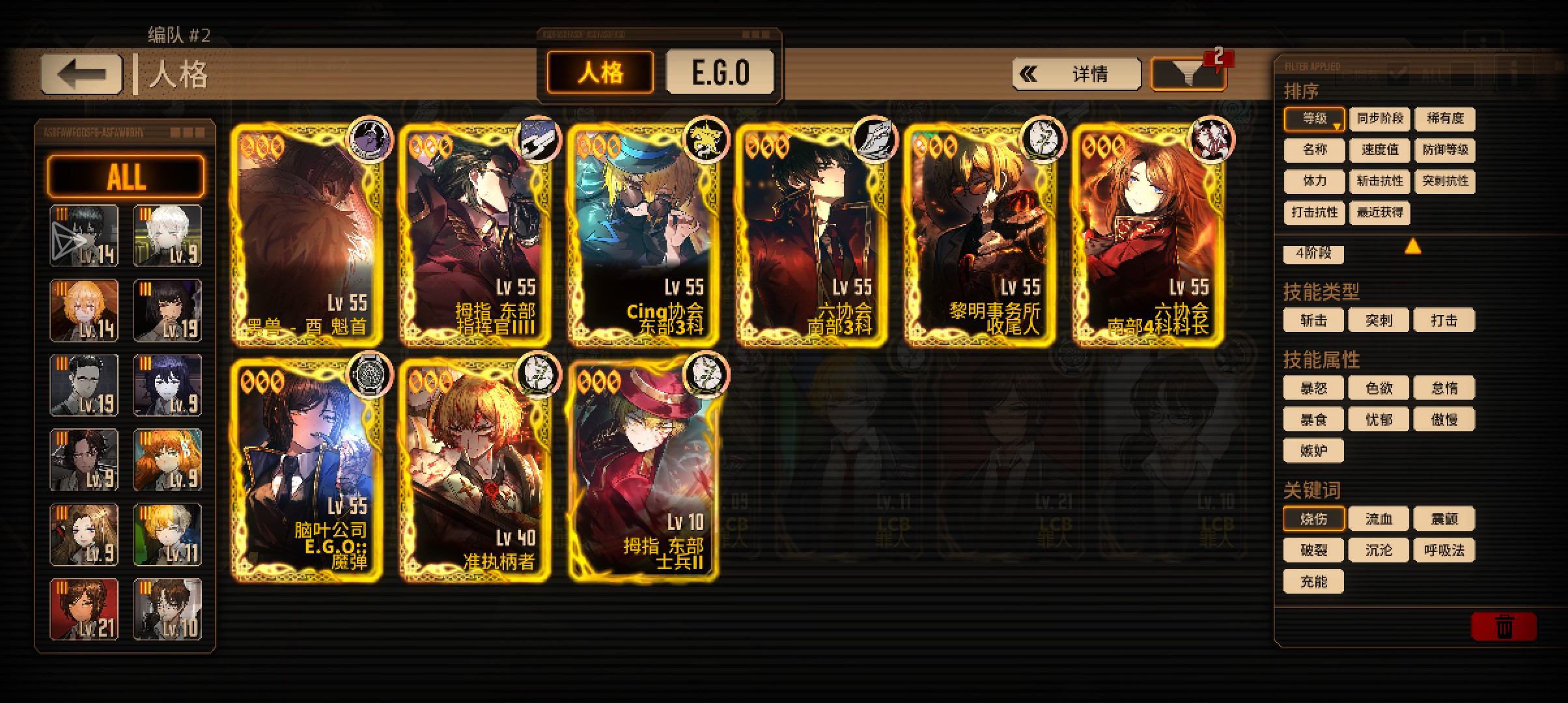 水玛(臼齿玛 挂层) 管家奥 管家浮 (山庄回响加伤) 林顿虫(继承人虫) 亡蝶葬仪EGO(非必需) 花香有独一档的沉沦泛滥(造成沉沦强度×层数的忧郁伤害)一般拿来速通/核爆