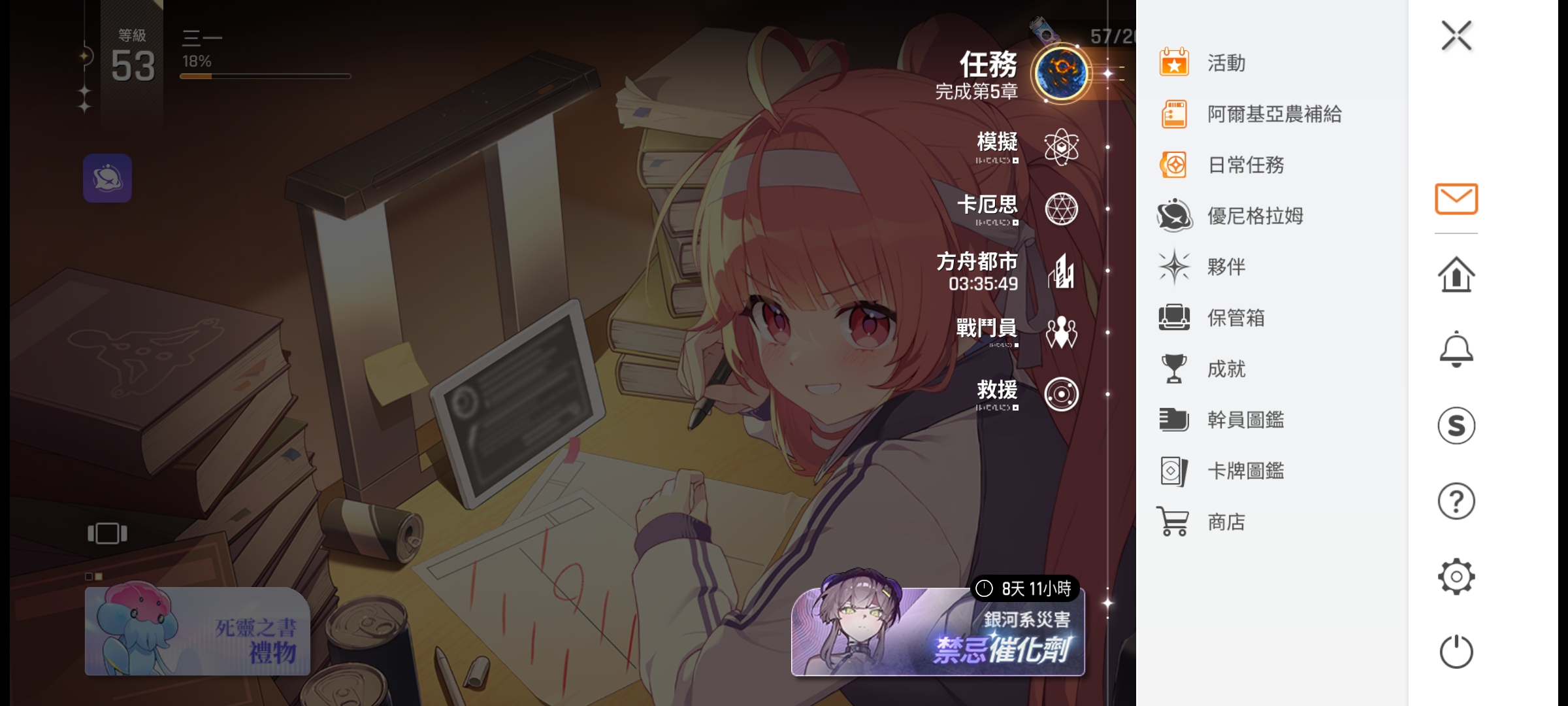 新人刚玩卡厄思的时候都需要先解决汉化问题。话不多说,上图。第一张图这里是主界面,点击右上角的三个横可以弹出侧弹窗如下