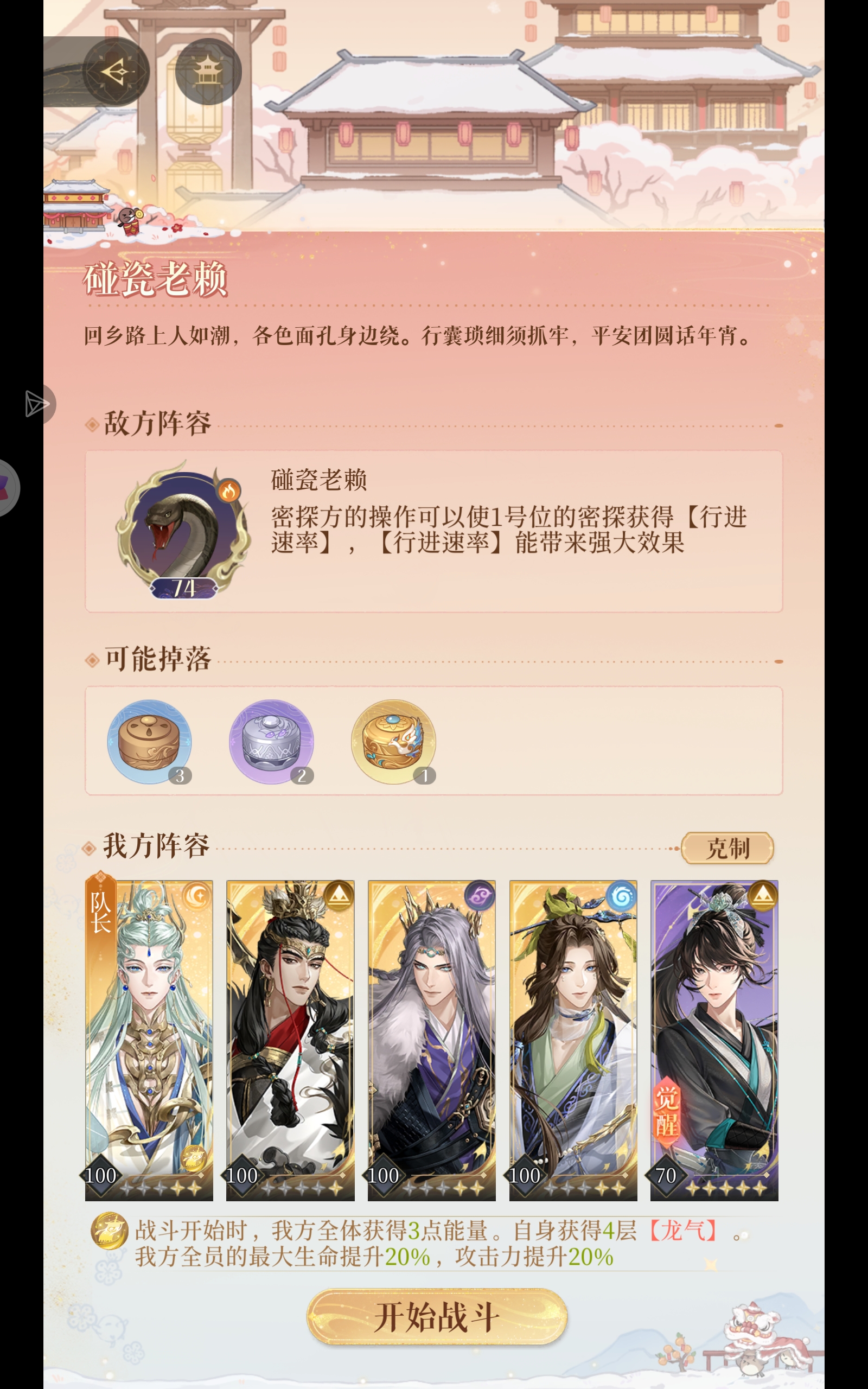 感谢🙏🏻我看其他老师这个阵容的攻略了,虽然我都有,但主要是吕布得养,最好二星,一星吕布不够狠啊,还要洗命盘,庞羲也得洗,刘璋也是,我真的不美了美了美了,但我却醉了醉了醉了(眼睛袅袅了)主要都是要练度,第二阶段人家二星吕布直接秒了,我的总在第二阶段就结束了,目前就只能养练度了,感觉马上新出的密探看起来应该挺好用的,到时候再试试