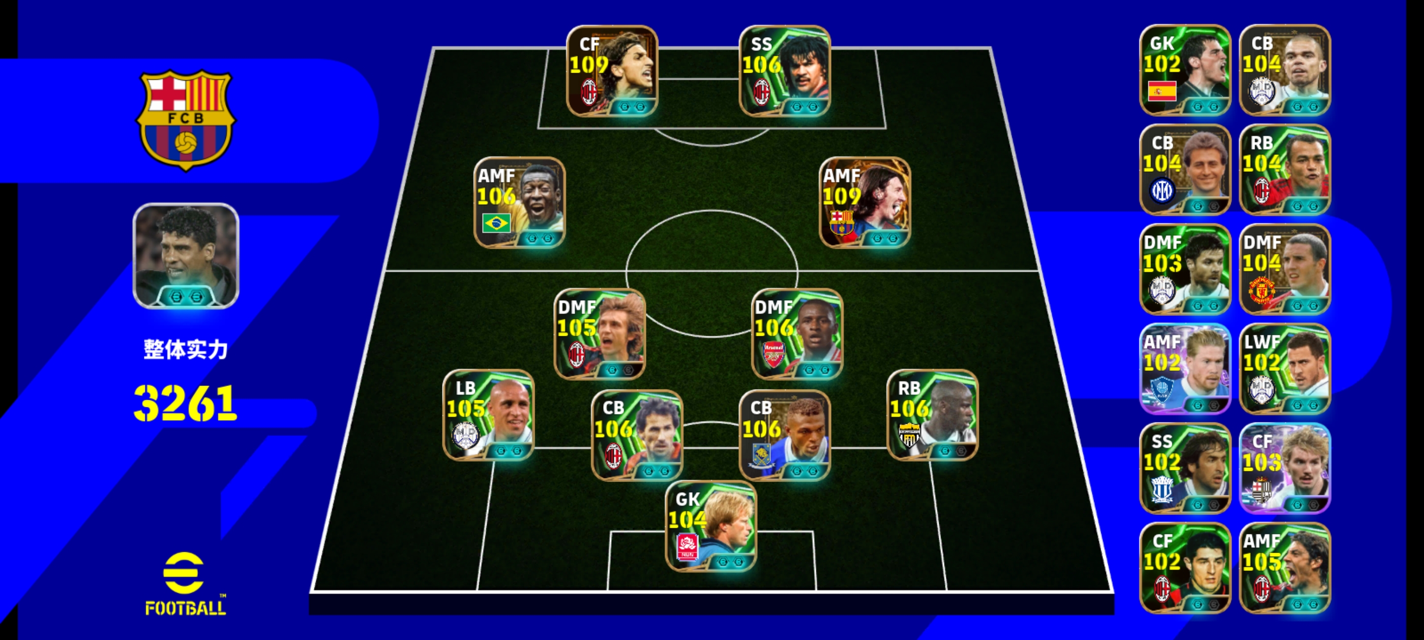 咱俩阵容差不多,我觉得第一就是你俩中后卫太矮了,最少要上一个高点,多的那个可以和我一样踢边中卫。第二就是前场伊布和古利特俩高中锋上一个就行了,另一个换偷猎者,不然没人前叉了。另外还有皮尔洛踢中前卫好一点,踢后腰容易待在后场不出来,反而让维埃拉往前冲。还有你那个组前贝利踢前腰没风格,踢影锋好一点。建议你搞个4-1-2-3阵型