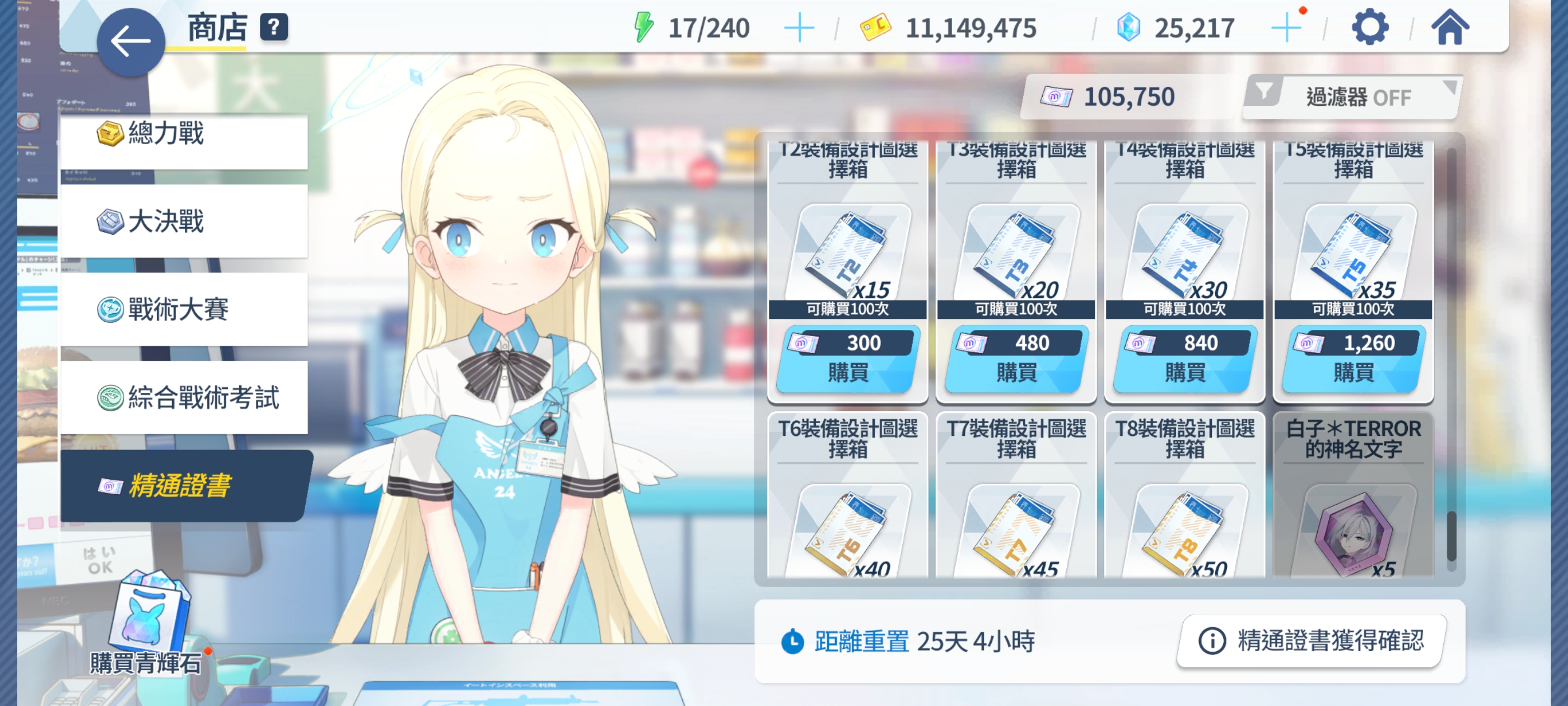 那正好今天有空,我就提点建议吧 大决战 总力战:在升角色技能的时候什么技能书不够买什么技能书,角色碎片看情况 悬赏通缉:买点谷物或技能书,情况同上(有点贵,看着点买) jjc(竞技场):再有多倍掉落活动时买体力,角色碎片看情况 综合测评:买点制造用的合成石(忘了叫啥了),个人建议优先金色等级跟彩色等级的 精通证书:买装备图纸,情况依旧同1,角色碎片 哪些角色牛真他宝贝得带劲买什么(依旧有点贵,看着点买) 第二三张图片里的是国际服之前的一个活动,这个自选我看就是新手不够用,老手用不上[wulian]