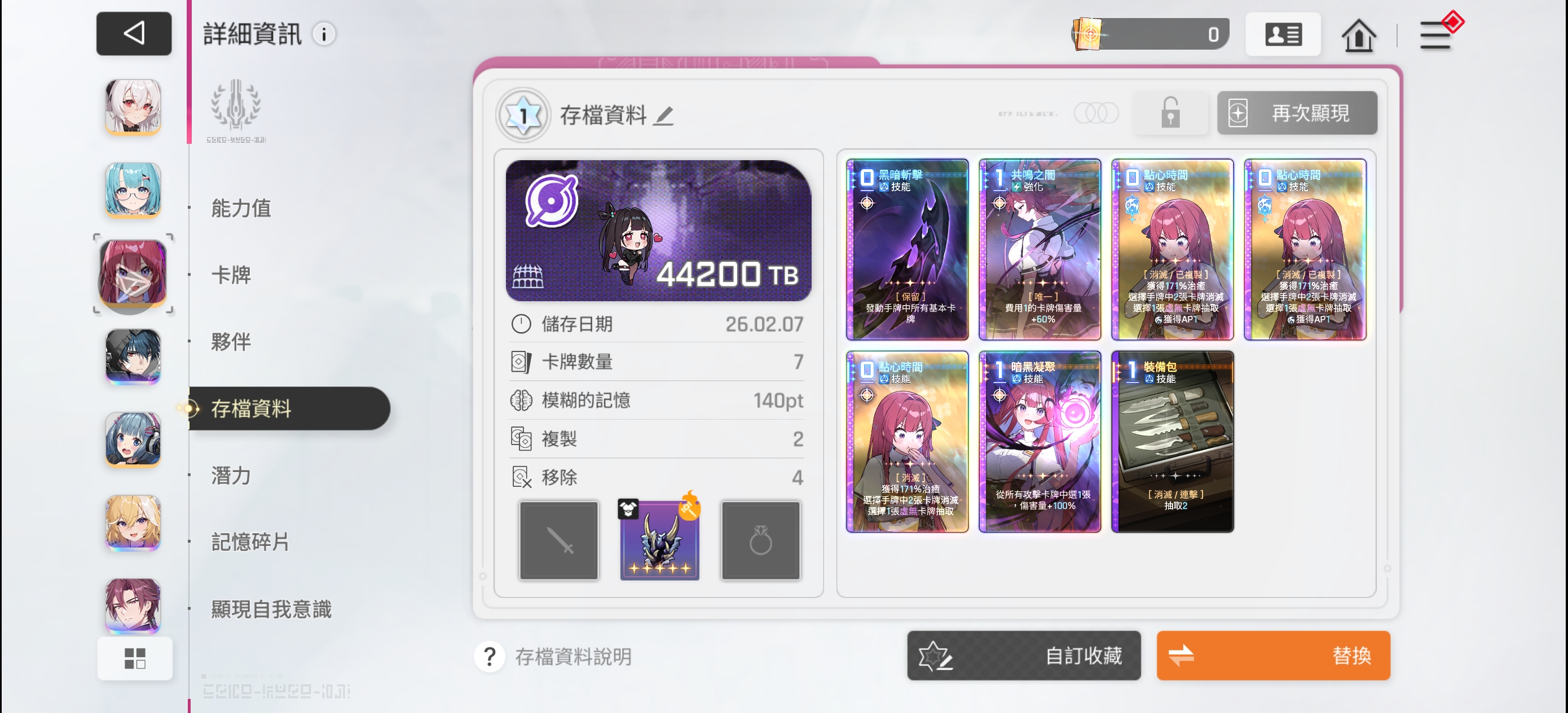 这个档如果用来配虚无男只能说毕业了 拿来配女主其实也不错 配千鹤的话千鹤就不能拿黄昏了,打长线费用会有一点点影响,但是问题不大。这个存档值得让千鹤不带黄昏