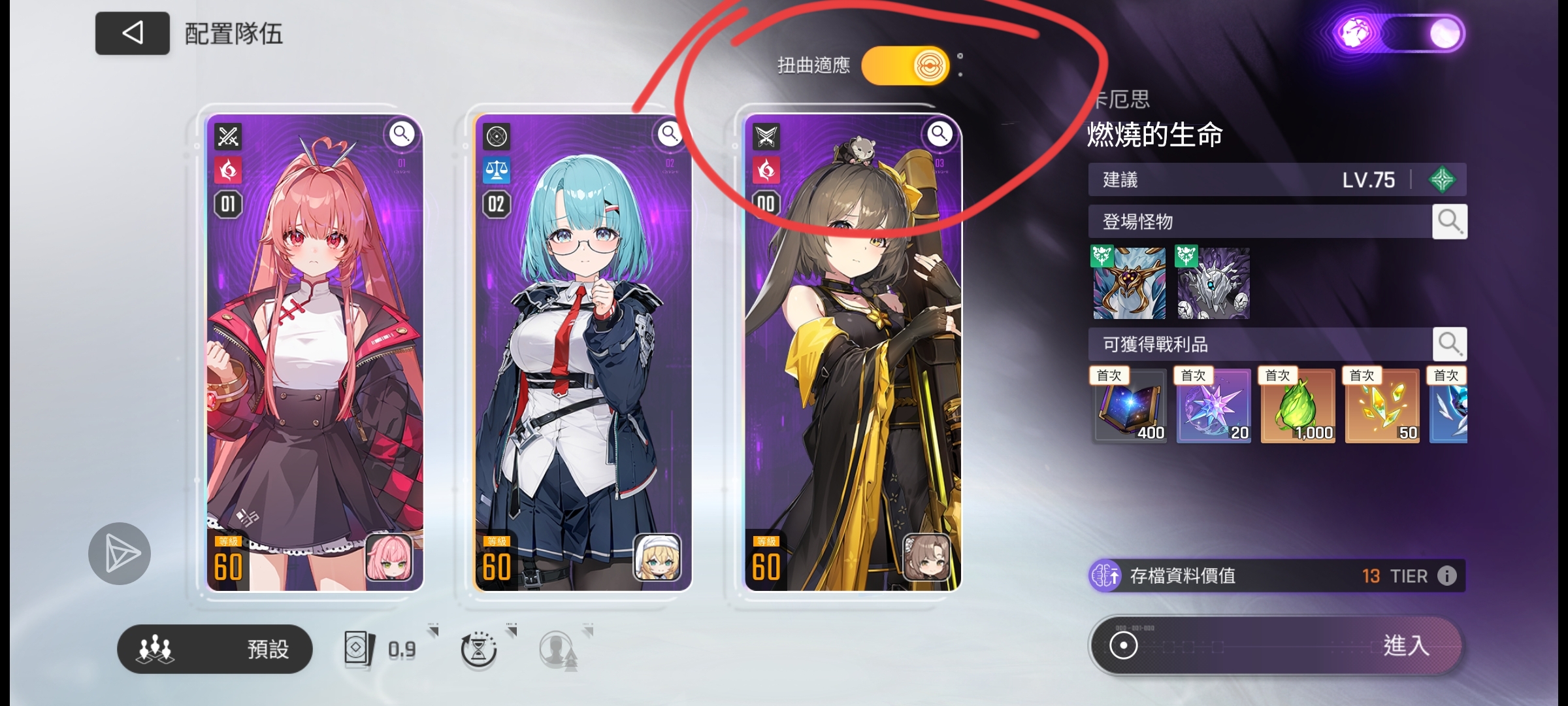 简单描述,角色试用模式,只要你有角色打开这个开关系统会自动送你一套面板并且可以自选伙伴(包括没有的专武),而且武器和人物都是58级,甚至可以用来刷你还没有养的人的存档
