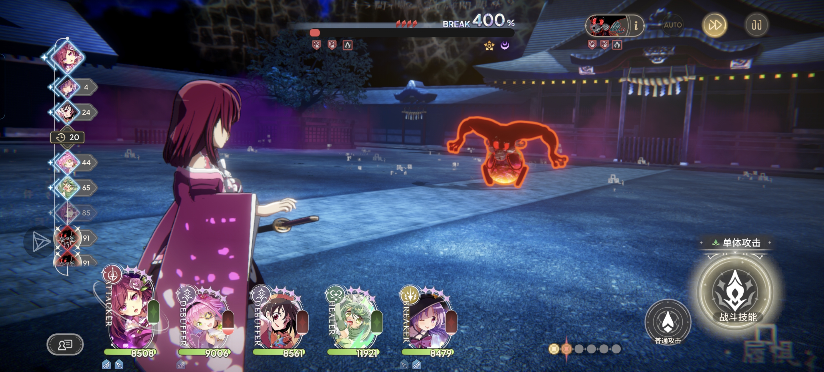 破韧之前,主c和奶妈就不要开技能,奶妈带充能画,A两下其实就可以满大了,技能全交给负面手和击破手就行了。击破之后花凛就别放战绩了,奶妈要全程a,实在生存不够再放战技,接下来就是重复之前的操作,boss就能被磨死。