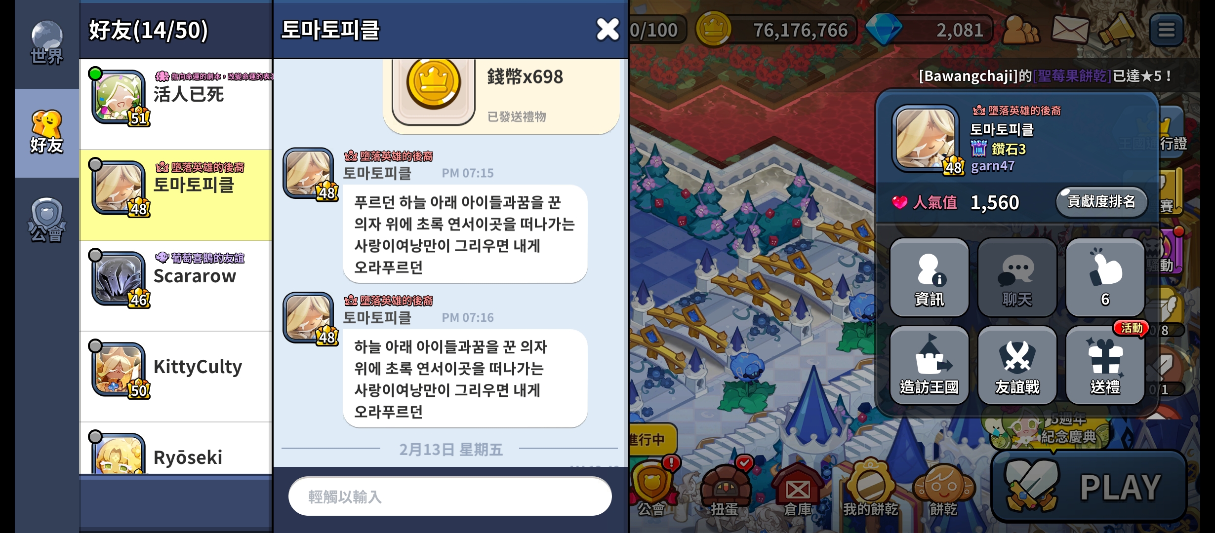今天一上线送每天随机礼物的时候发现有个韩国的好友给我发了两个消息,,,?我去翻译了一下,感觉牛头不对马嘴的。翻看聊天记录发现我之前都有在送每天随机礼物给好友(包括他),他没给我回礼物,然后刚好碰上了活动,送爱心礼物(就那个每天限制送50用金币送的),送完礼物后,我一上线就发现这个消息,他会不会是曲解了我的意思?😱😇