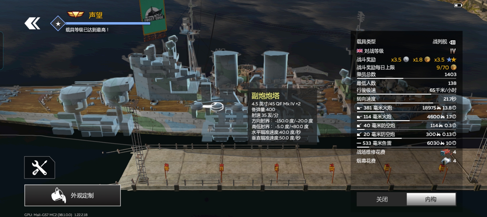 作为一艘战列舰,它的身上竟然有20门4.5英寸刮痧炮以及骇死人的每秒1.7发射速,和那3对主炮相比那主炮就跟三儿吉祥物一样,论爆发性它很废但论持续输出,它肯定是个夯